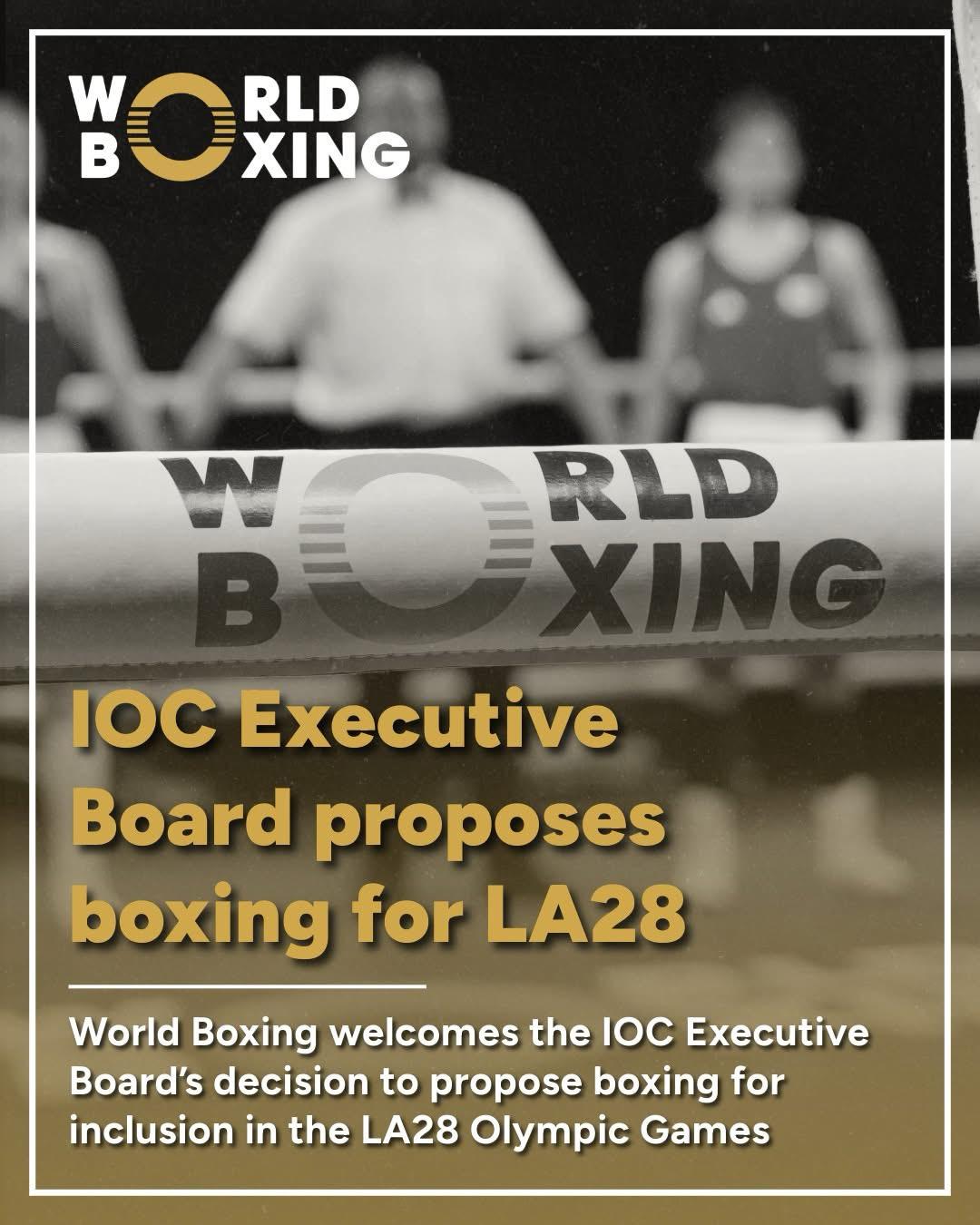 اعتمد المكتب التنفيذي للجنة الأولمبية الدولية برئاسة السويسري توماس باخ تشكيل الاتحاد العالمي للملاكمة خلال الاجتماع المقام في اليونان حاليا، ليكون هو المسؤول عن رياضة الملاكمة كاتحاد دولي منظم لقوانين اللعبة واحد الاتحادات الأولمبية التي تعمل تحت مظلتها واتخاذ المكتب التنفيذي قرار بادراج لعبة الملاكمة مرة أخري في أولمبياد لوس أنجلوس 2028، ليشرف بذلك علي تنظيم أولمبياد الشباب المقرر إقامتها السنغال بجانب دورة الألعاب الأولمبية لوس أنجلوس.