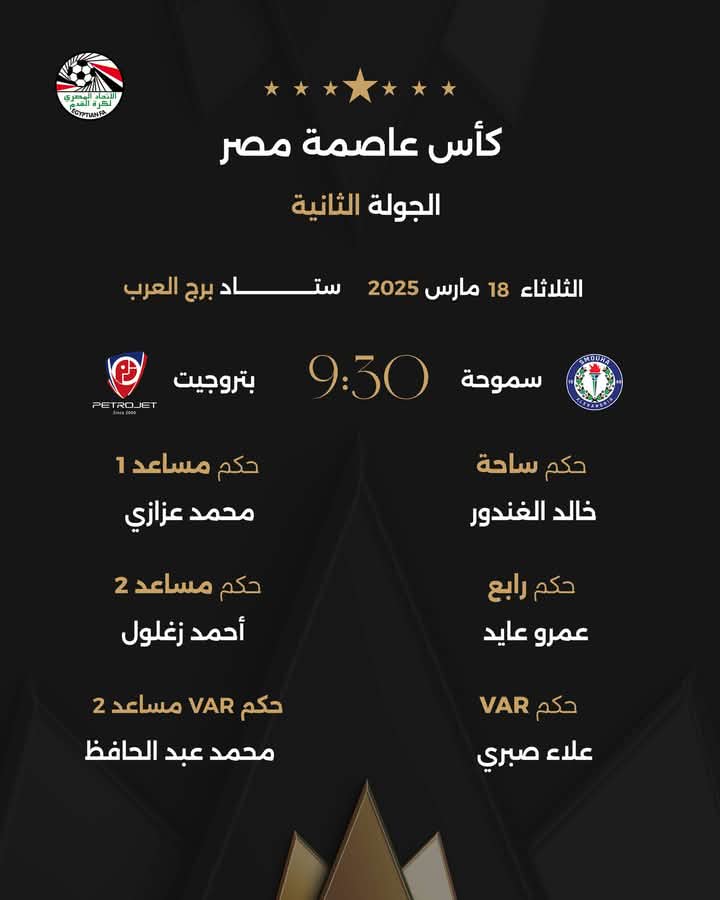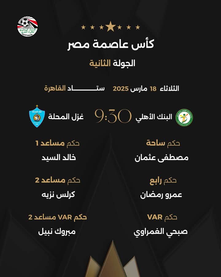 أعلنت لجنة الحكام، عن طاقمي حكام مباراتي، اليوم الثلاثاء، في الجولة الثانية من بطولة كأس الرابطة المصرية (كأس عاصمة مصر).