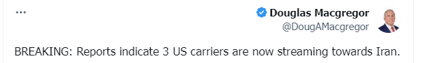 وقال الجنرال الأمريكي دوجلاس ماكجريجور عن اتجاه حاملات الطائرات الأمريكي إلى إيران: "تقارير تشير إلى أن 3 حاملات طائرات أميركية تتجه نحو إيران الآن."