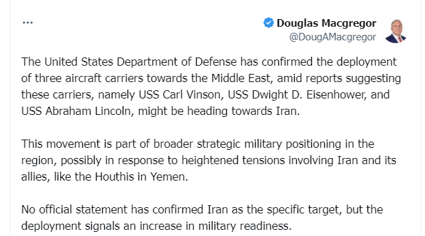 وكشف دوجلاس ماكجريجور عن حاملات الطائلات المتجهة لإيران، فقال: "أكدت وزارة الدفاع الأميركية نشر ثلاث حاملات طائرات باتجاه الشرق الأوسط، وسط تقارير تشير إلى أن هذه الحاملات، وهي يو إس إس كارل فينسون، ويو إس إس دوايت دي أيزنهاور، ويو إس إس أبراهام لينكولن، ربما تتجه نحو إيران."