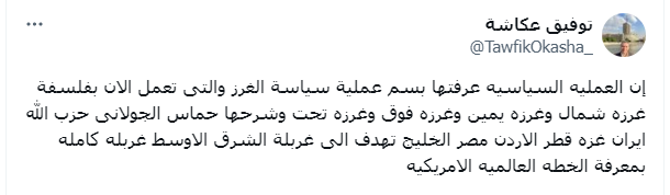 وعن خطجة الولايات المتحدة الأمريكية في المنطقة العربية والشرق الأوسط، قال توفيق عكاشة: "إلى من يرغب فى معرفة القادم من شعب مصر والعرب القادم هو كما ذكر نتنياهو حرفيًا.. خريطه جديده للشرق الأوسط تغير خريطه الشرق الأوسط بعد عام ١٩٥٠..."