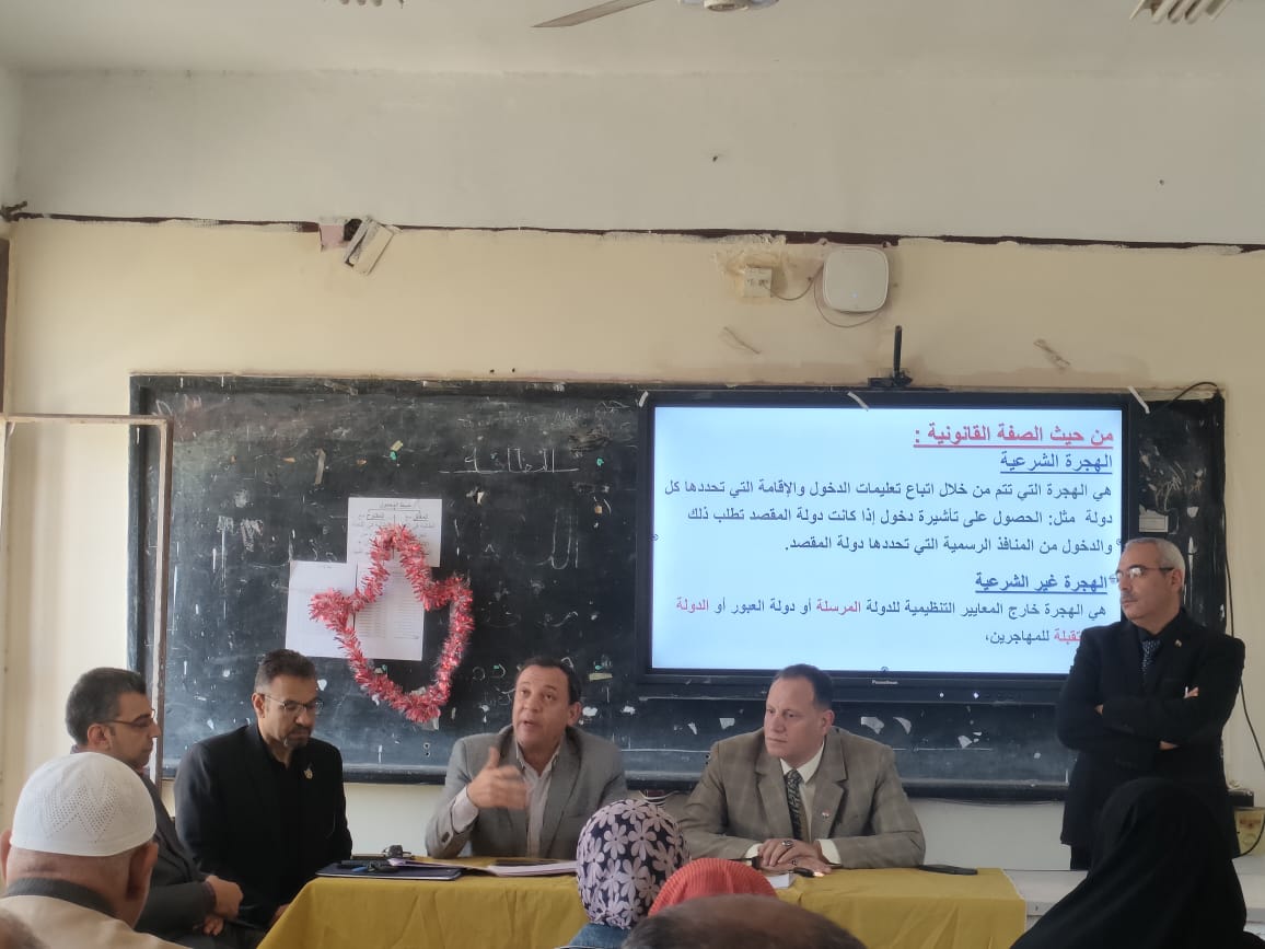 وتم عرض برنامج تقديمى حول الهجرة غير الشرعية وجريمة تهريب المهاجرين وذلك بعرض المفاهيم والمصطلحات ذات العلاقة وأهم الأطر القانونية ذات الصلة بالهجرة وكذلك دور اللجنة الوطنية التنسيقية لمكافحة الهجرة غير الشرعية وإنشاء صندوق مكافحة الهجرة غير الشرعية وحماية المهاجرين والشهود وقد تم تلقى جميع الاستفسارات وتم الرد عليها وتم الاتفاق على ضرورة العمل على الجانب التوعوى ونشر ثقافة مجابهة الهجرة غير الشرعية وجرائم تهريب المهاجرين لطلاب المدارس وذلك بطرق وأفكار متنوعة فى صورة( ندوات ولقاءات والتعبير الفنى بالرسم وكلمات بالاذاعة المدرسية وأعمال مسرحية ومطويات ولافتات.... )، وكذلك زيادة تفعيل دور وحدات تيسير الانتقال لسوق العمل بالتعليم الفنى.