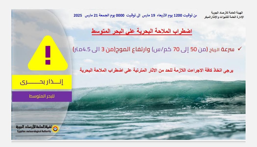 كما حذرت الأرصاد من طقس غدا الخميس 20 مارس 2025، مؤكدة أنه يشهد اضطراب الملاحة بالبحر المتوسط وسرعة الرياح (50: 70 كم/س) وارتفاع الأمواج (3: 4.5 متر).