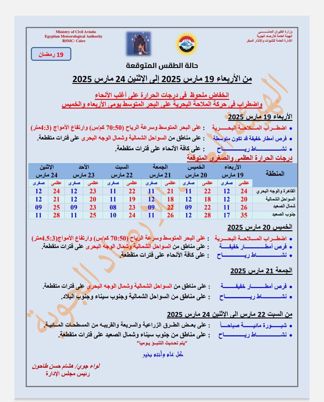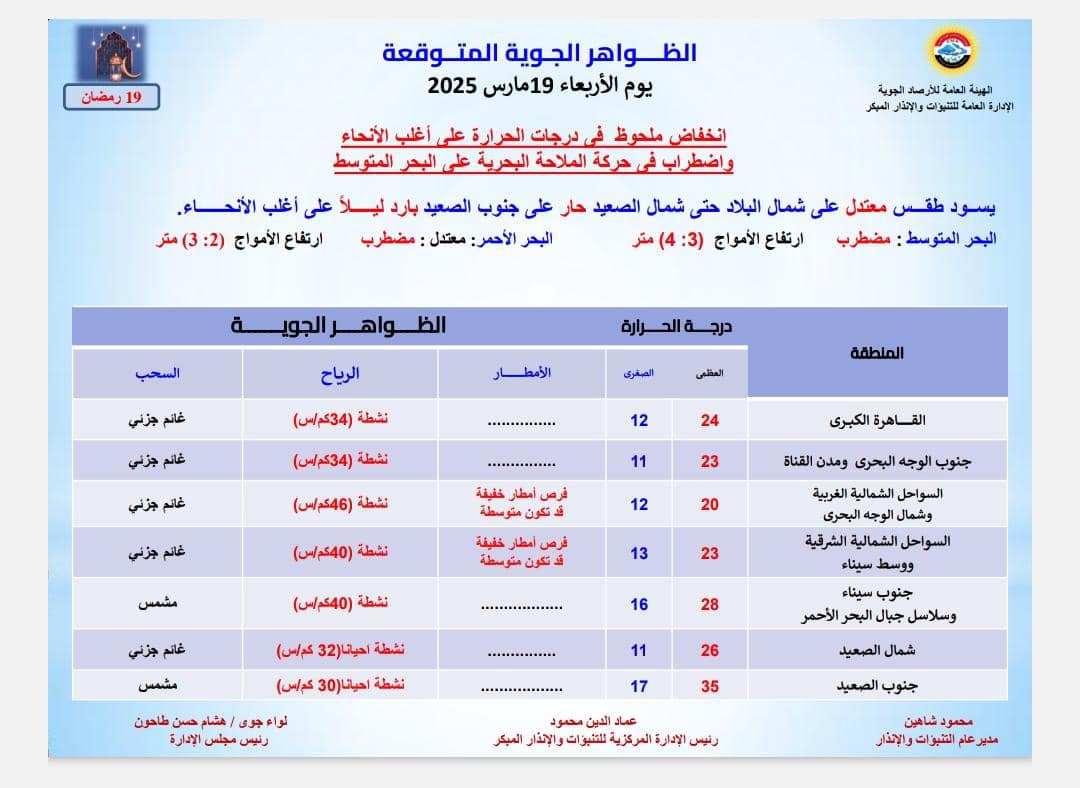 وأشارت إلى أنه ومن المتوقع أن يحدث انخفاض آخر فى درجات الحرارة وعودة الأجواء الشتوية اعتبارًا من اليوم الأربعاء 19 مارس 2025.