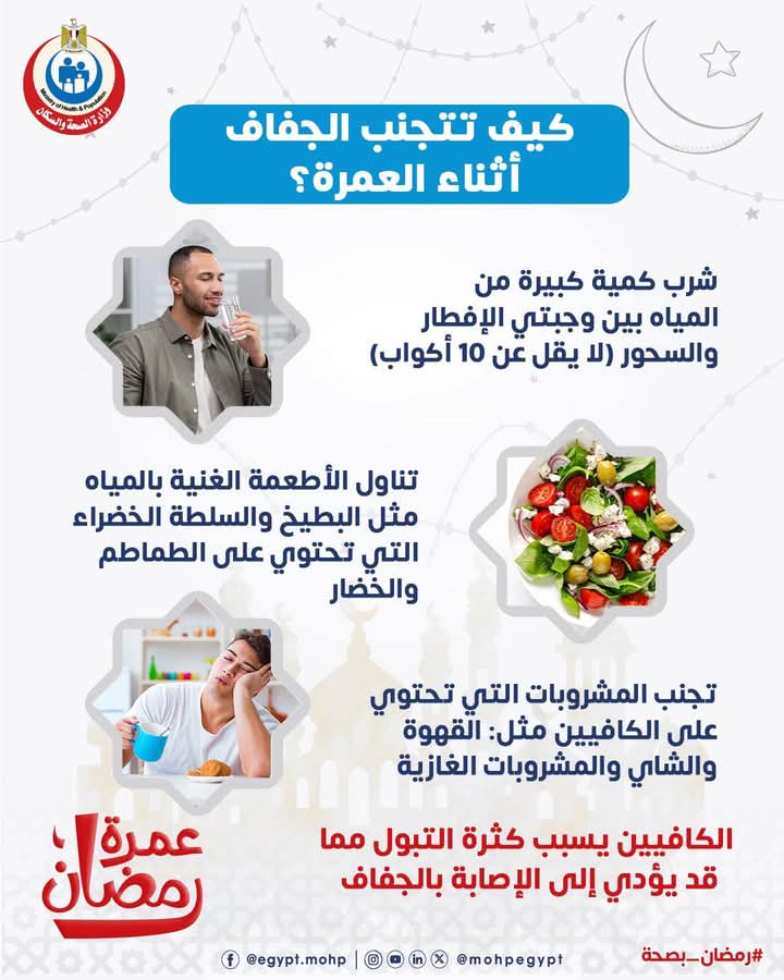 ووجهت وزارة الصحة نصائح لتجنب الإصابة بالجفاف أثناء العمرة خاصة مع المجهود الشاق الذي يبذله المعتمرين.