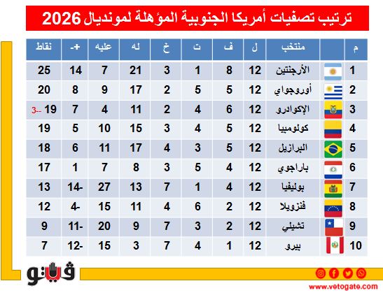 ويتصدر ليونيل ميسي نجم الأرجنتين جدول ترتيب هدافي تصفيات أمريكا الجنوبية المؤهلة لبطولة كأس العالم 2026 قبل الجولة الـ 13.