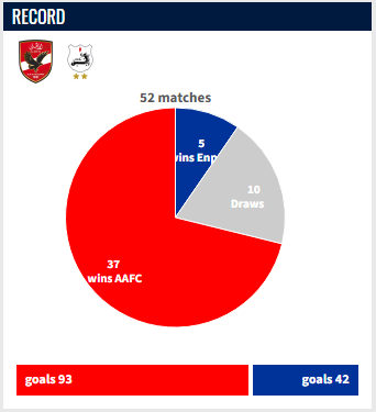 أحرز لاعبو الأهلي 93 هدفا في شباك الفريق البترولي، فيما أحرز لاعبي إنبي 42 هدفا في شباك الأحمر.