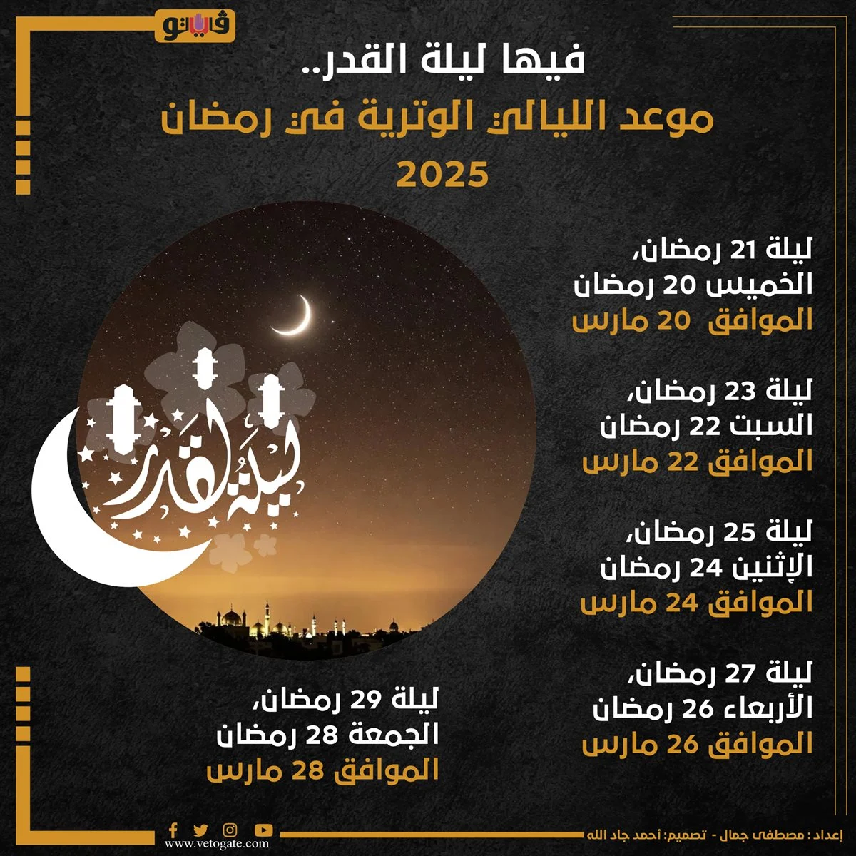 ليلة 25 رمضان: تبدأ مع مغرب الاثنين 24 رمضان وتنتهي مع فجر الثلاثاء 25 رمضان.