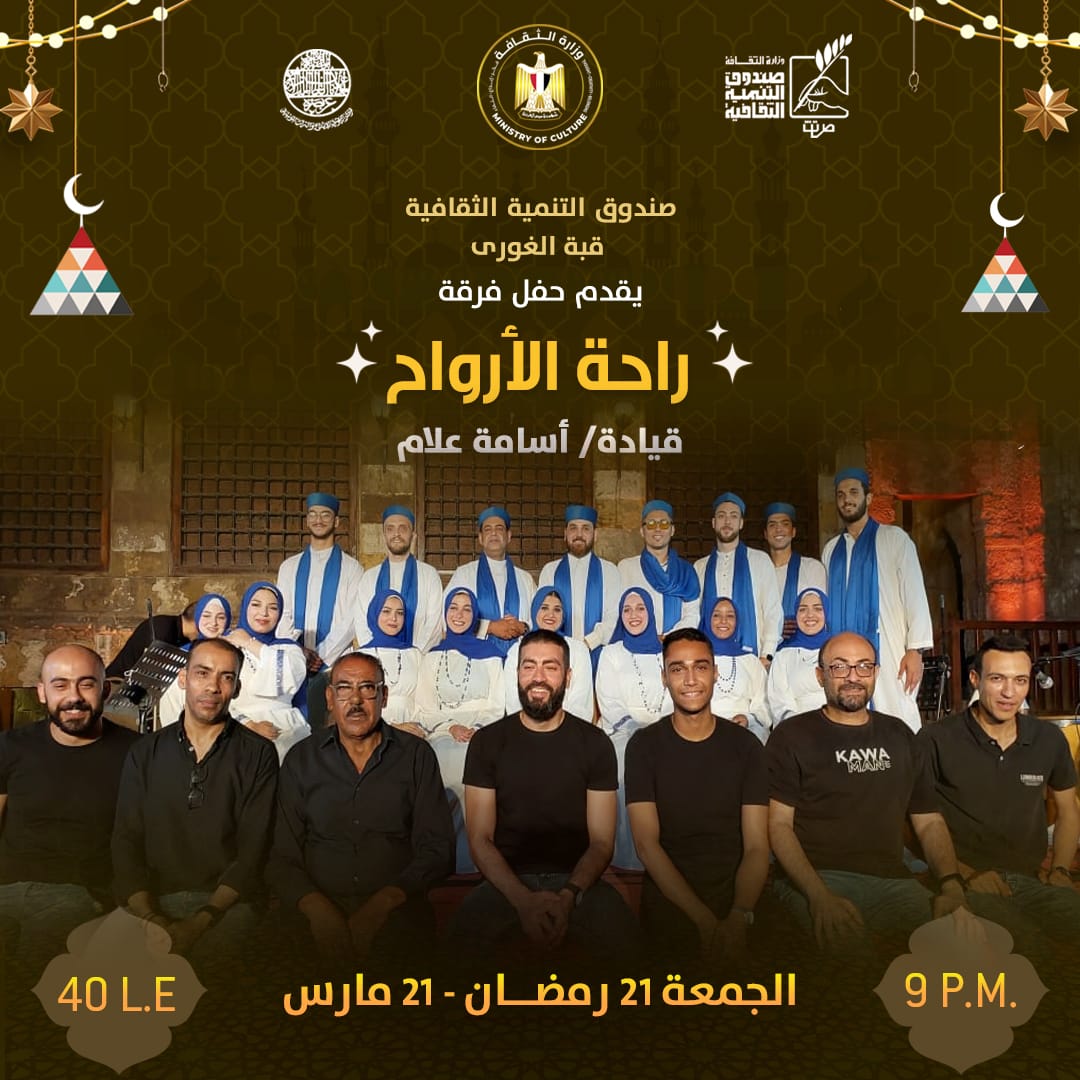 وفي شارع الأزهر تقام في مركز إبداع قبة الغوري، أمسية دينية تقدمها فرقة "راحة الأرواح" بقيادة المنشد “أسامة علام” والتي تأسست عام 2020، وتهدف رسالتها إلى نشر التراث والقيم الروحية والسلام، كما تنشد إلى تقديم الفنون الهادفة التي تحمل كل معاني الحب لمديح النبي الكريم.