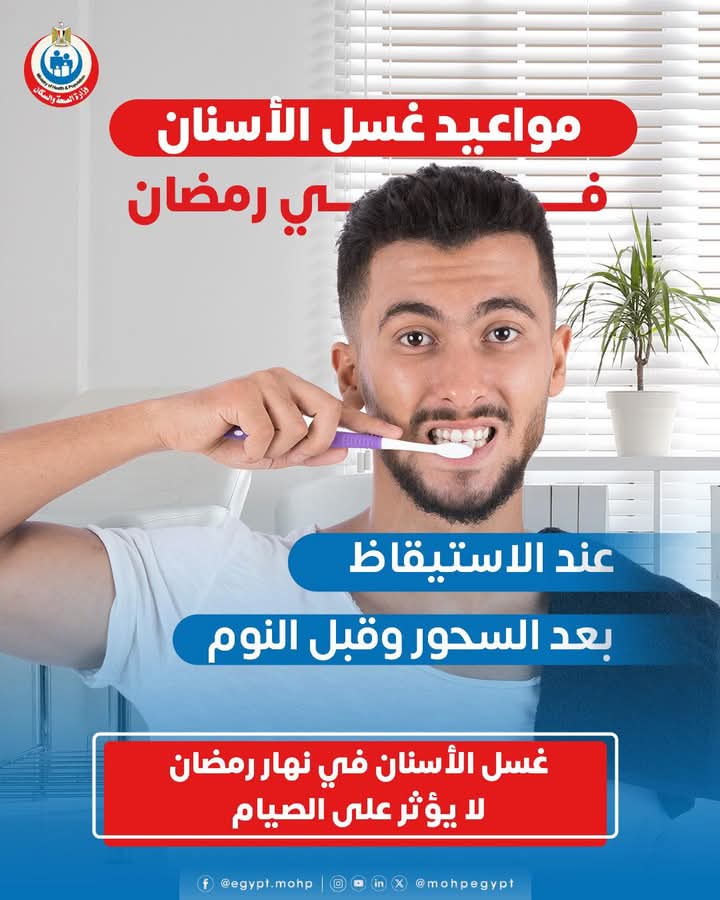 أكدت وزارة الصحة ضرورة غسل الأسنان في شهر رمضان عند الاستيقاظ وبعد السحور وقبل النوم، مشيرة إلى أن غسل الأسنان في نهار رمضان لا يؤثر في الصيام.
