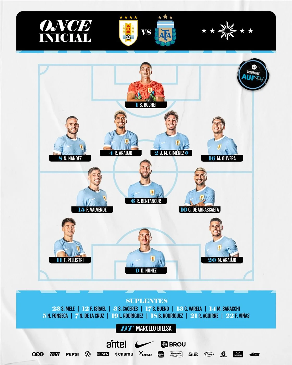 وغاب عن تشكيل الأرجنتين أمام أوروجواي ليونيل ميسي وباولو ديبالا ولاوتارو مارتينيز، الذين تم استبعادهم من جانب المدرب بسبب الإصابة.