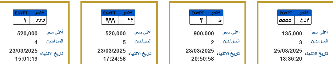 وجاءت أبرز اللوحات المعدنية المميزة؛ لوحة م ن ع 5555" بسعر 135 ألف جنيه ويتنافس عليها 3 أشخاص، لوحة معدنية " ط 3" بسعر 900 ألف جنيه ويتنافس عليها شخصين، لوحة معدنية " م م 999" بسعر 520 ألف جنيه ويتنافس عليها 5 أشخاص، لوحة معدنية " وس س 1 " بسعر 520 ألف جنيه ويتنافس عليها 4 أشخاص.