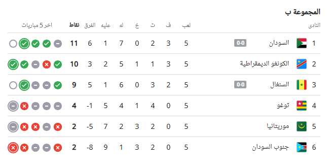 بهذه النتيجة يواصل منتخب السودان تصدره للمجموعة الثانية برصيد 11 نقطة فيما يأتي السنغال في المركز الثالث برصيد 9 نقاط.