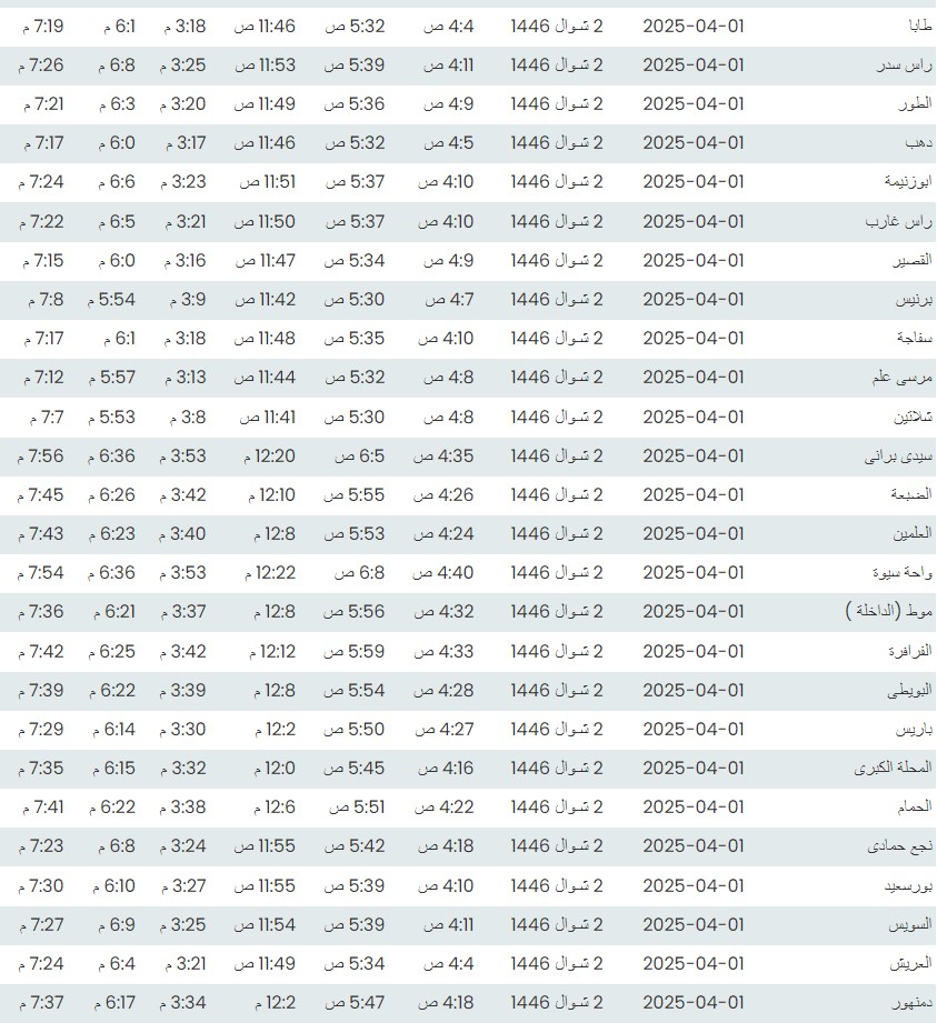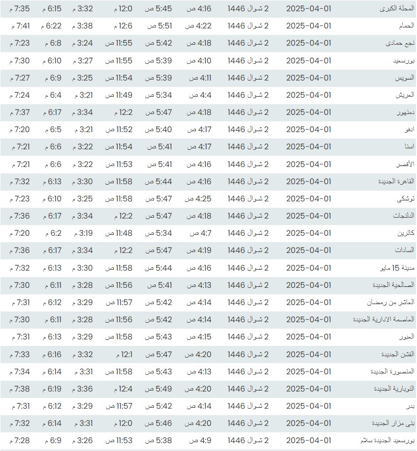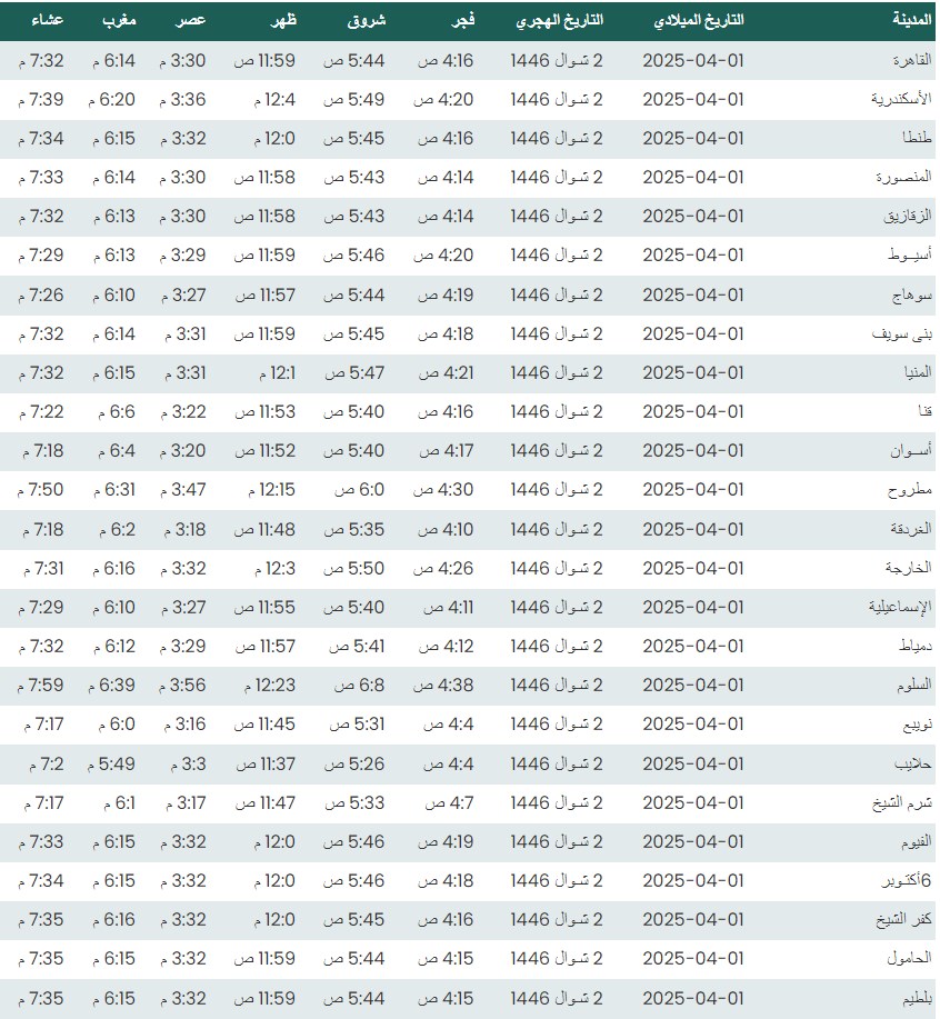 وفيما يلي مواقيت الصلاة، لعدد من مدن ومحافظات الجمهورية من واقع بيانات الهيئة العامة للمساحة