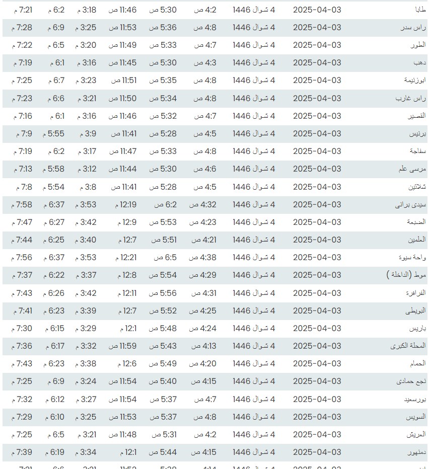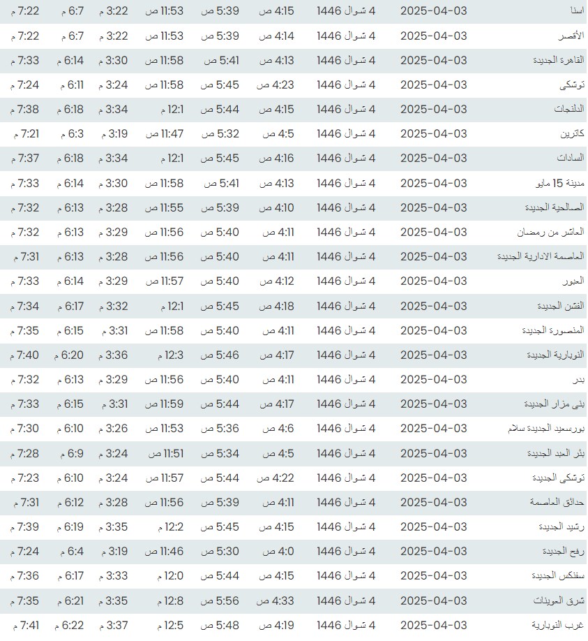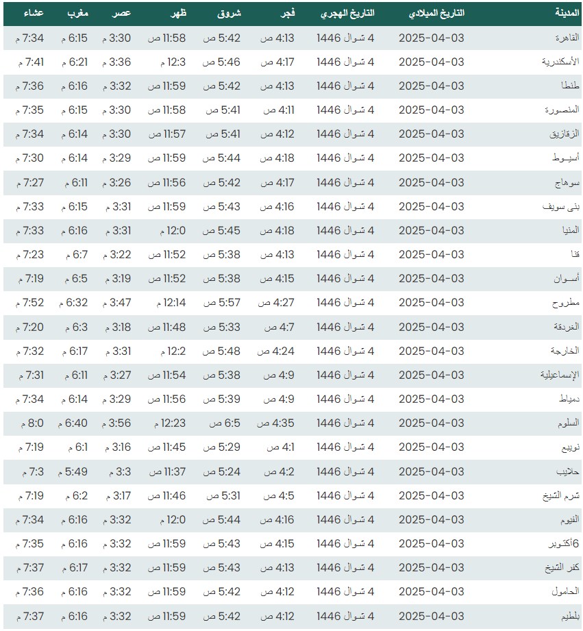 مواقيت الصلاة اليوم الخميس 3 – 4 - 2025 في القاهرة والمحافظات
