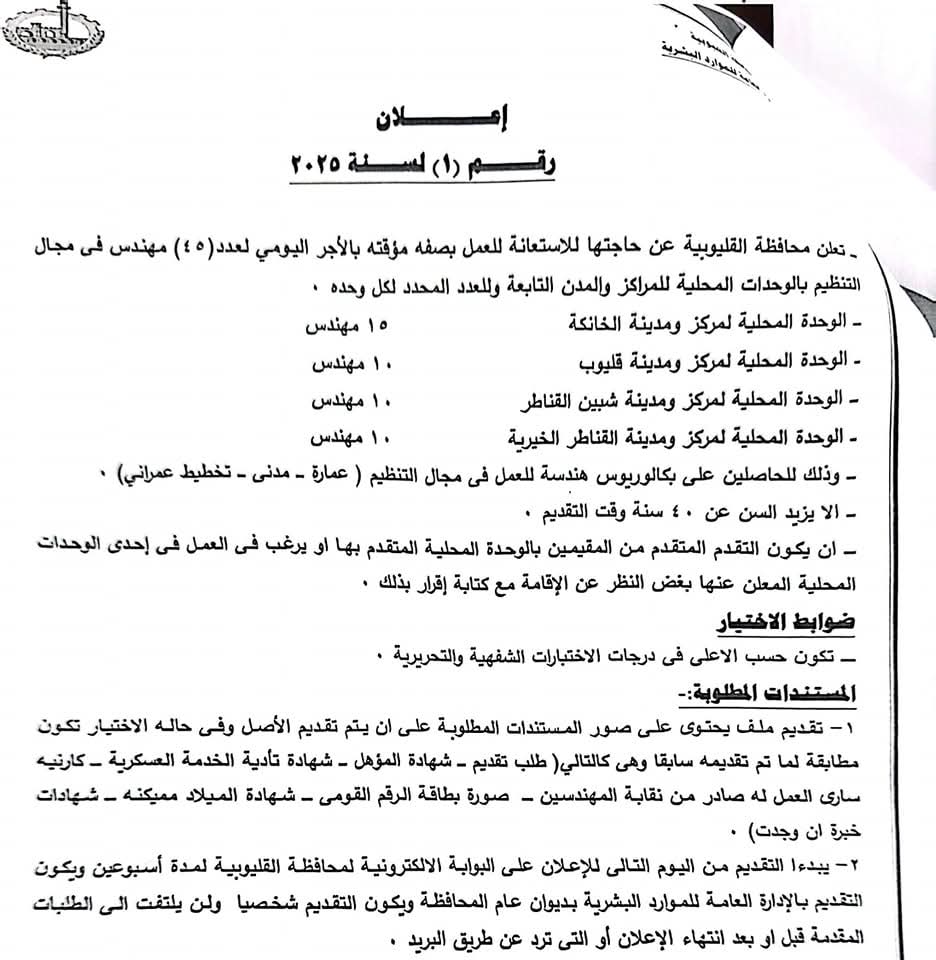 محافظة القليوبية تعلن عن حاجتها لـ 45 مهندسًا للعمل بالوحدات المحلية