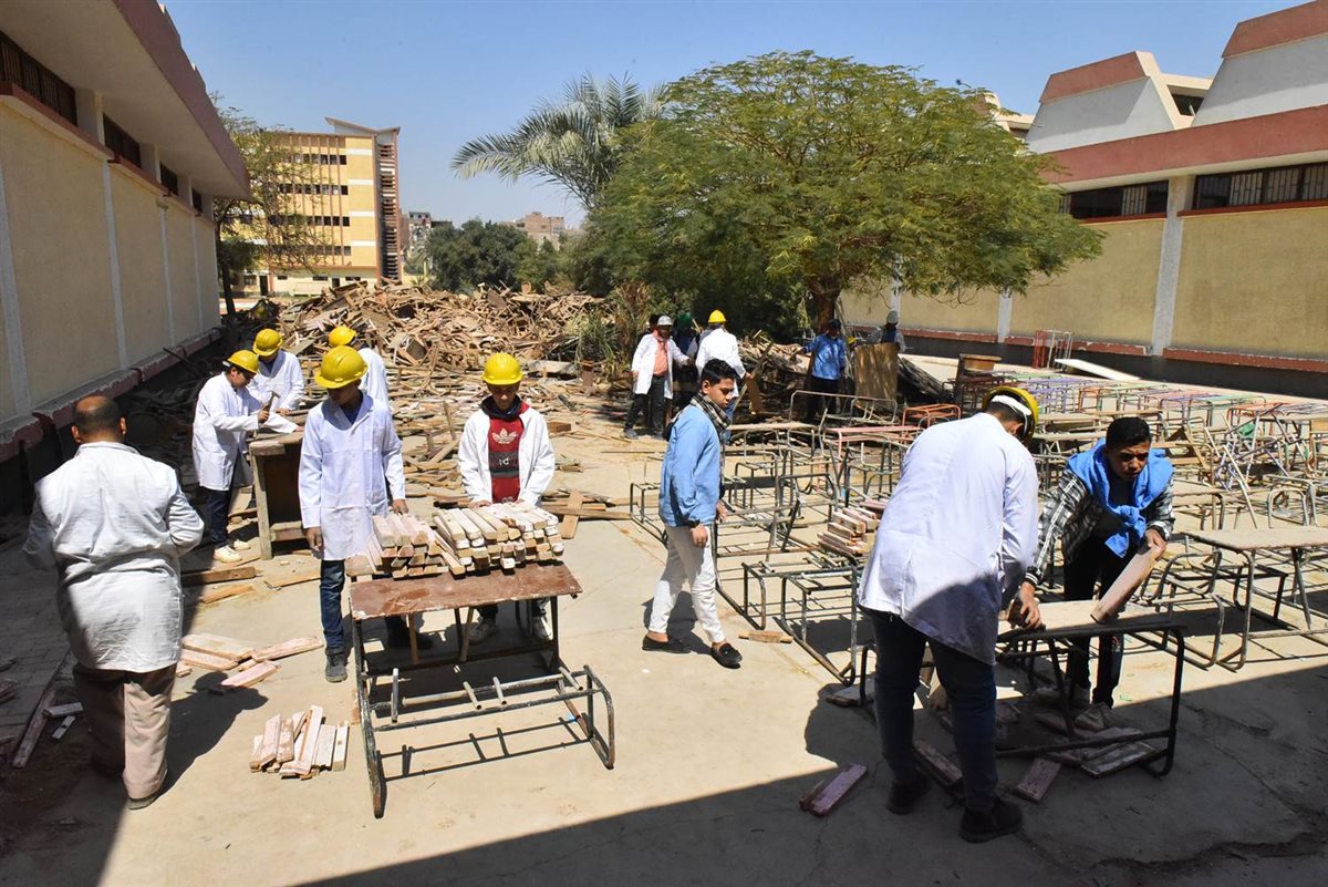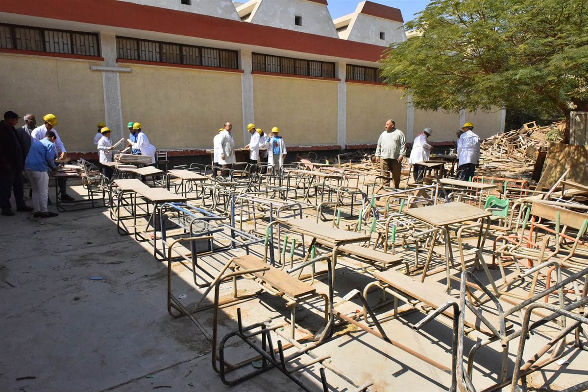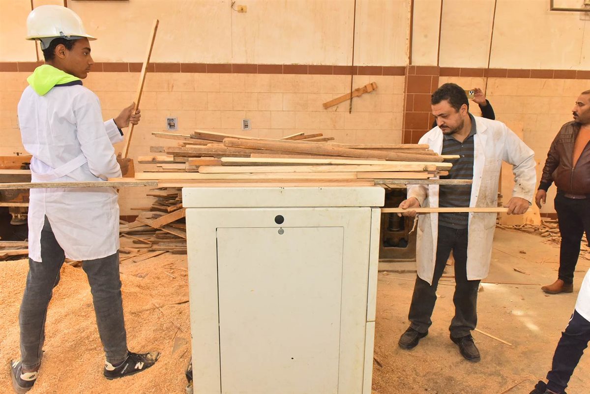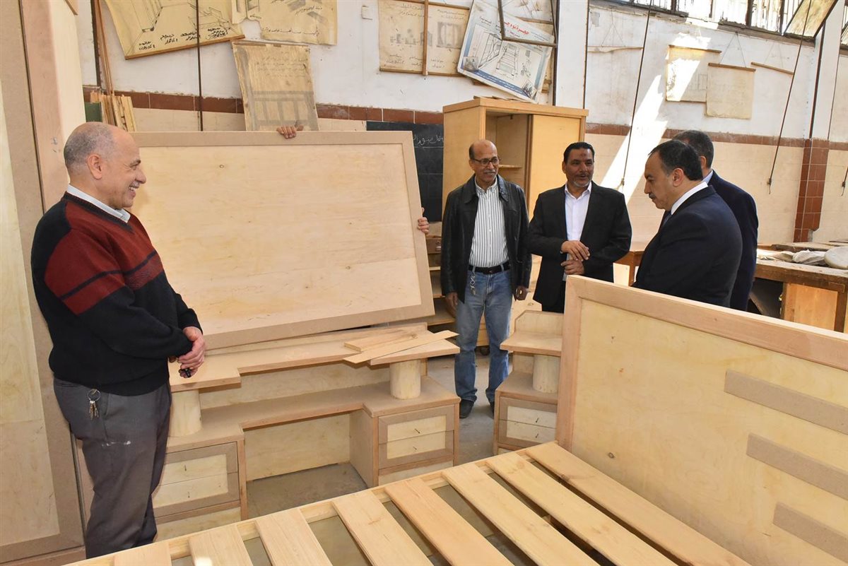 وتفقد محافظ أسيوط ؛ الأعمال الجارية بورش المدرسة من فرز وتصنيف الأخشاب القديمة والرواكد فضلًا عن أعمال إعادة التدوير والإستفادة من الإمكانات المتاحة وتحويلها لمنتجات مصنعة عن طريق طلاب ومدرسي المدرسة كإنتاج الكراسي والترابيزات والمقاعد المدرسية وغرف نوم وغيرها من المنتجات في أقسام نجارة الأثاث والتطعيم والماركتري وخرط الخشب.