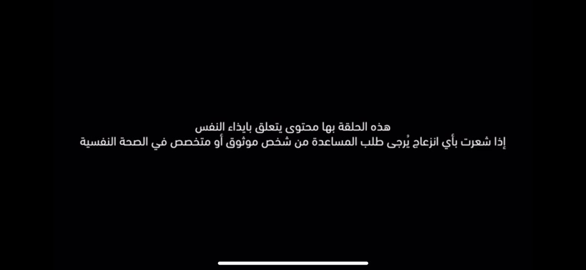 وجاءت الرسالة كالتالي: "هذه الحلقة بها محتوى يتعلق بإيذاء النفس.. إذا شعرت بأي انزعاج يرجي طلب المساعدة من شخص موثوق أو متخصص في الصحة النفسية".