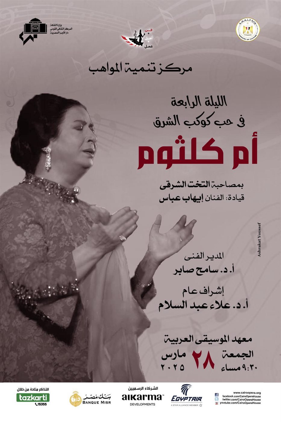 تنظم دار الأوبرا برئاسة الدكتور علاء عبد السلام الليلة الرابعة فى حب كوكب الشرق أم كلثوم لطلاب مركز تنمية المواهب تحت إشراف مديره الفنى الدكتور سامح صابر بمصاحبة التخت الشرقى قيادة الفنان إيهاب عباس وذلك فى التاسعة والنصف مساء الجمعة ٢٨ مارس بمعهد الموسيقى العربية وذلك ضمن فعاليات الثقافة المصرية خلال عام أم كلثوم.