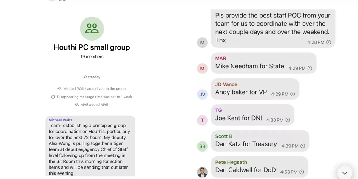 وأرسلت تفاصيل الخطة، التي تم إرسالها وبحث تفاصيلها، عبر تطبيق "سيجنال" للدردشة، في مجموعة كانت تضم مسئولين أمريكيين رفيعين، ورئيس تحرير مجلة "أتلانتيك" جيفري جولدبرج، الذي تمت إضافته للمجموعة بطريق الخطأ.