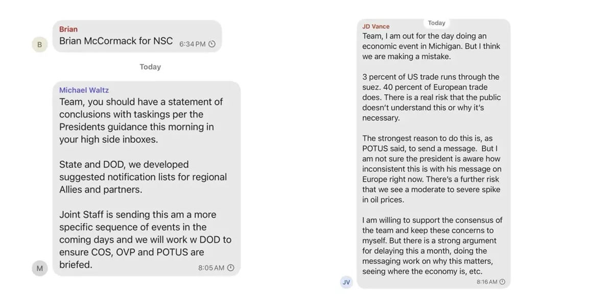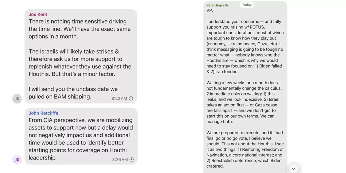 وتضيف: "على سبيل المثال، تلقى جولدبرج معلومات عن الهجمات قبل ساعتين من الموعد المقرر لبدء قصف مواقع الحوثيين. لو أن هذه المعلومات - وخاصةً مواعيد إقلاع الطائرات الأمريكية إلى اليمن - وقعت في أيدٍ غير أمينة خلال تلك الساعتين الحاسمتين، لكان الطيارون الأمريكيون وغيرهم من الموظفين الأمريكيين قد تعرضوا لخطر أكبر مما قد يواجهونه عادةً".