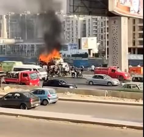 تفحم سيارة نقل التهمتها النيران أعلى دائري المعادي