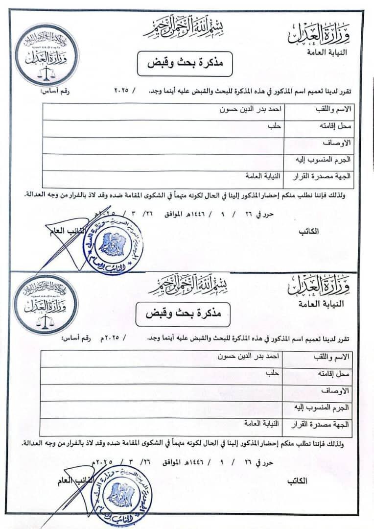 ونشرت الصحيفة صورة لمذكرة بحث وقبض على حسون بعد تقديم شكوى ضده.