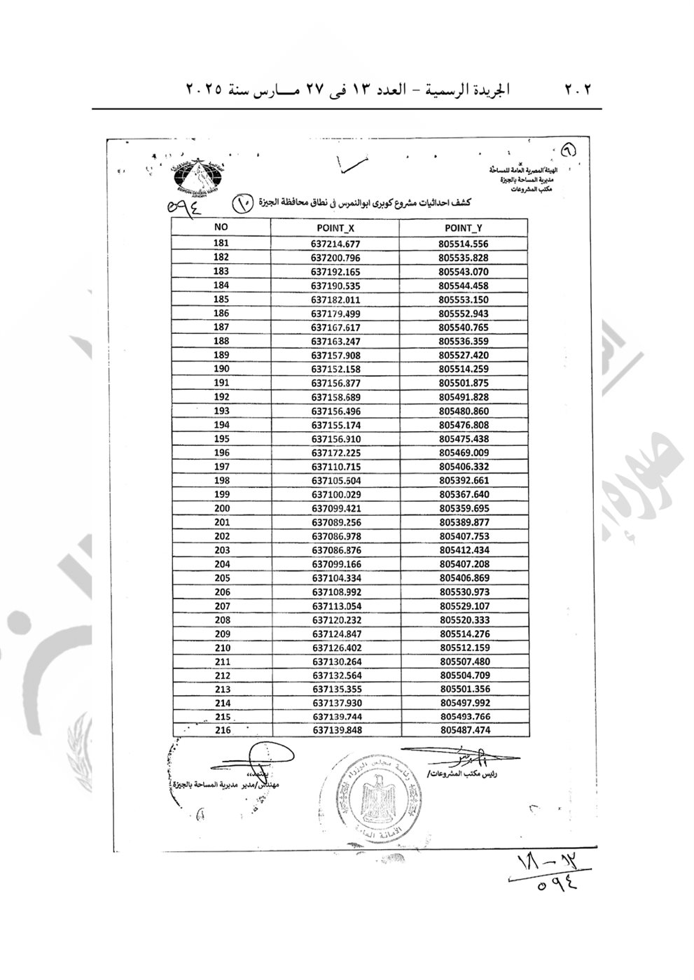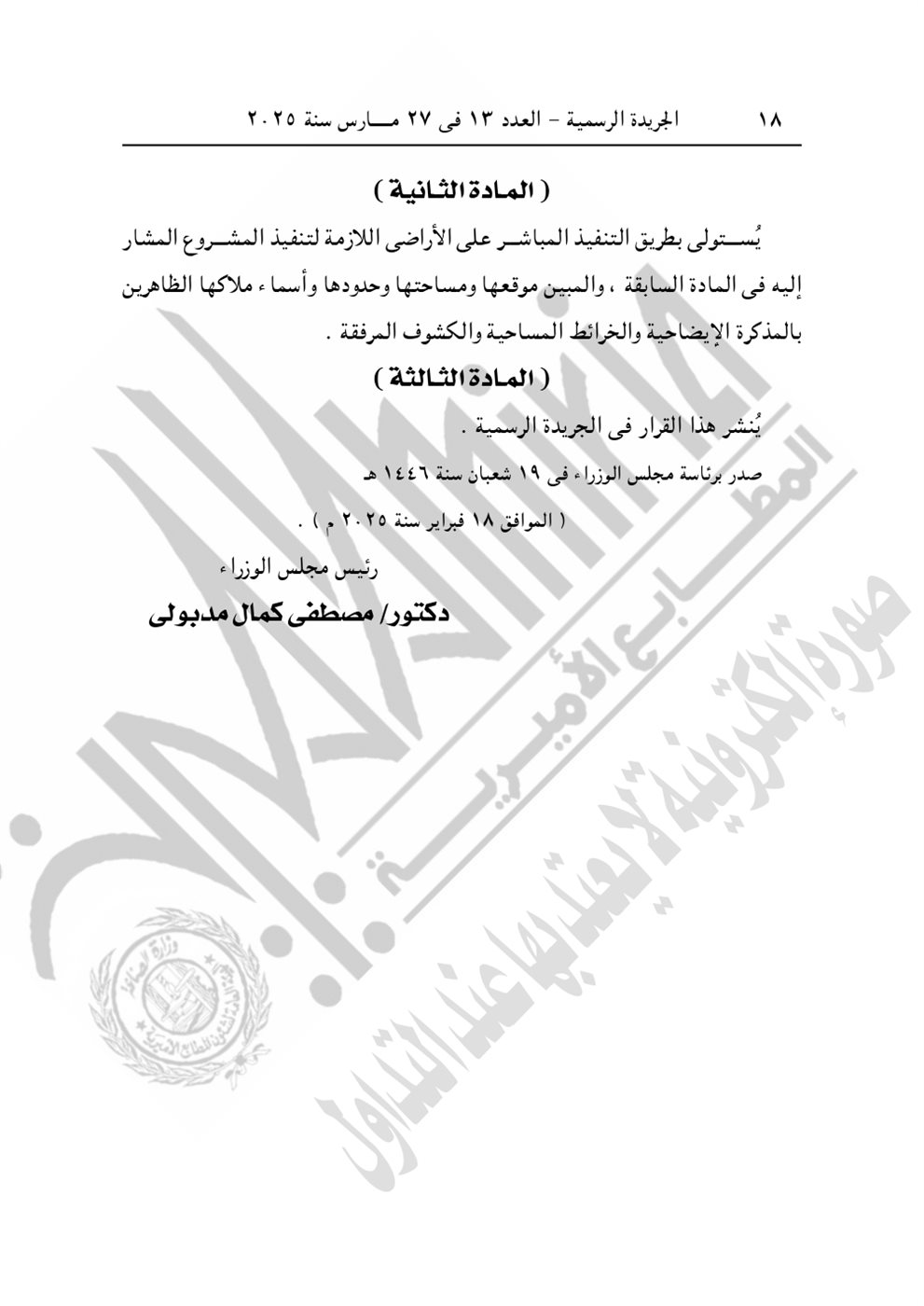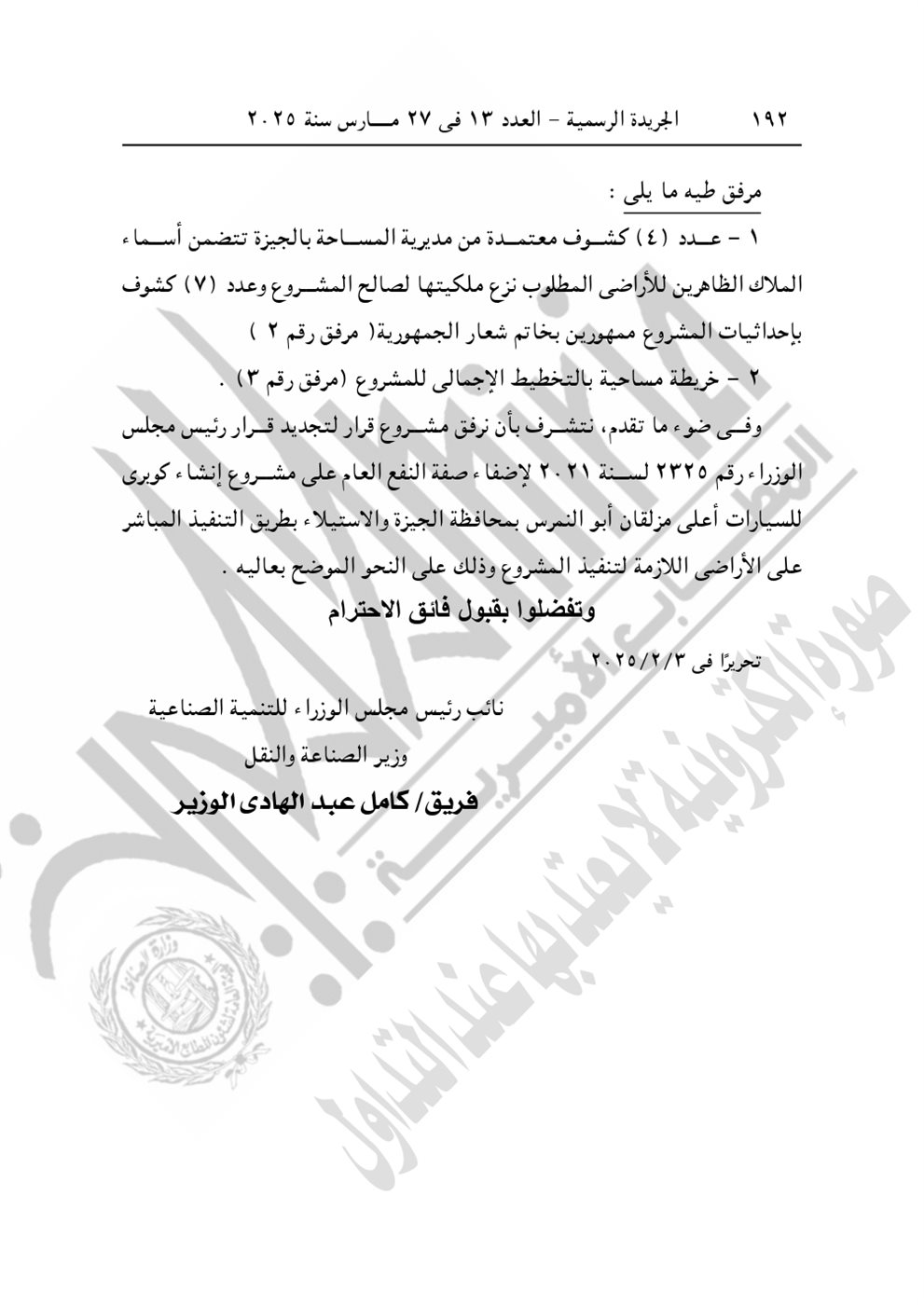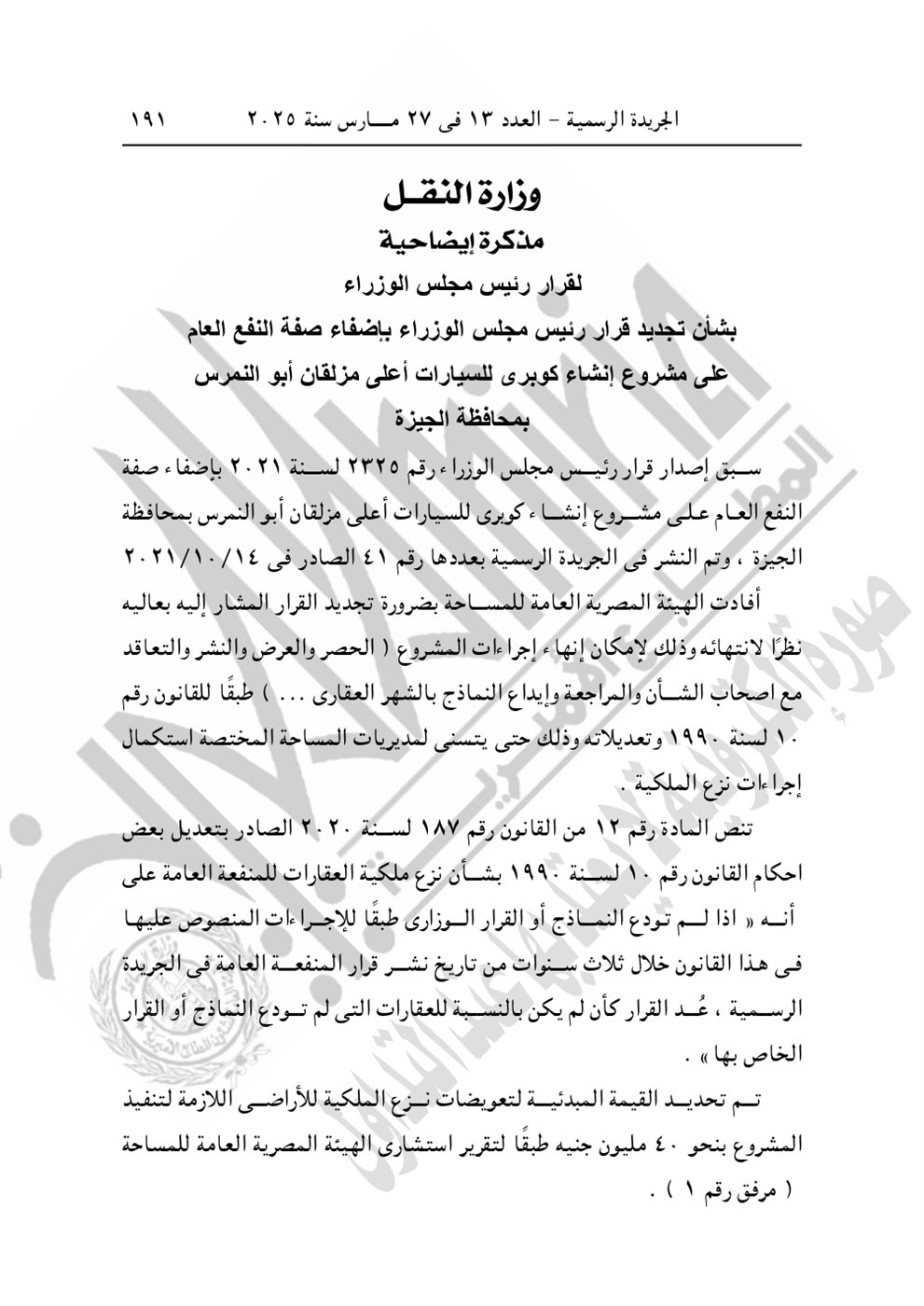 -و قرار رئيس مجلس الوزراء رقم 594 لسنة 2025، باعتبار مشروع إنشاء كوبرى للسيارات أعلى مزلقان أبو النمرس بمحافظة الجيزة، من أعمال المنفعة العامة.