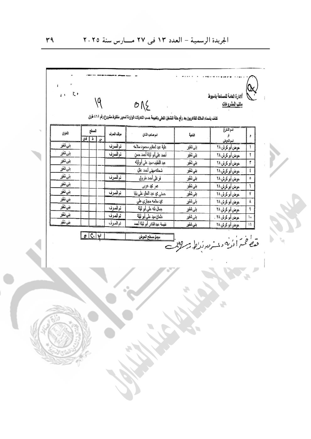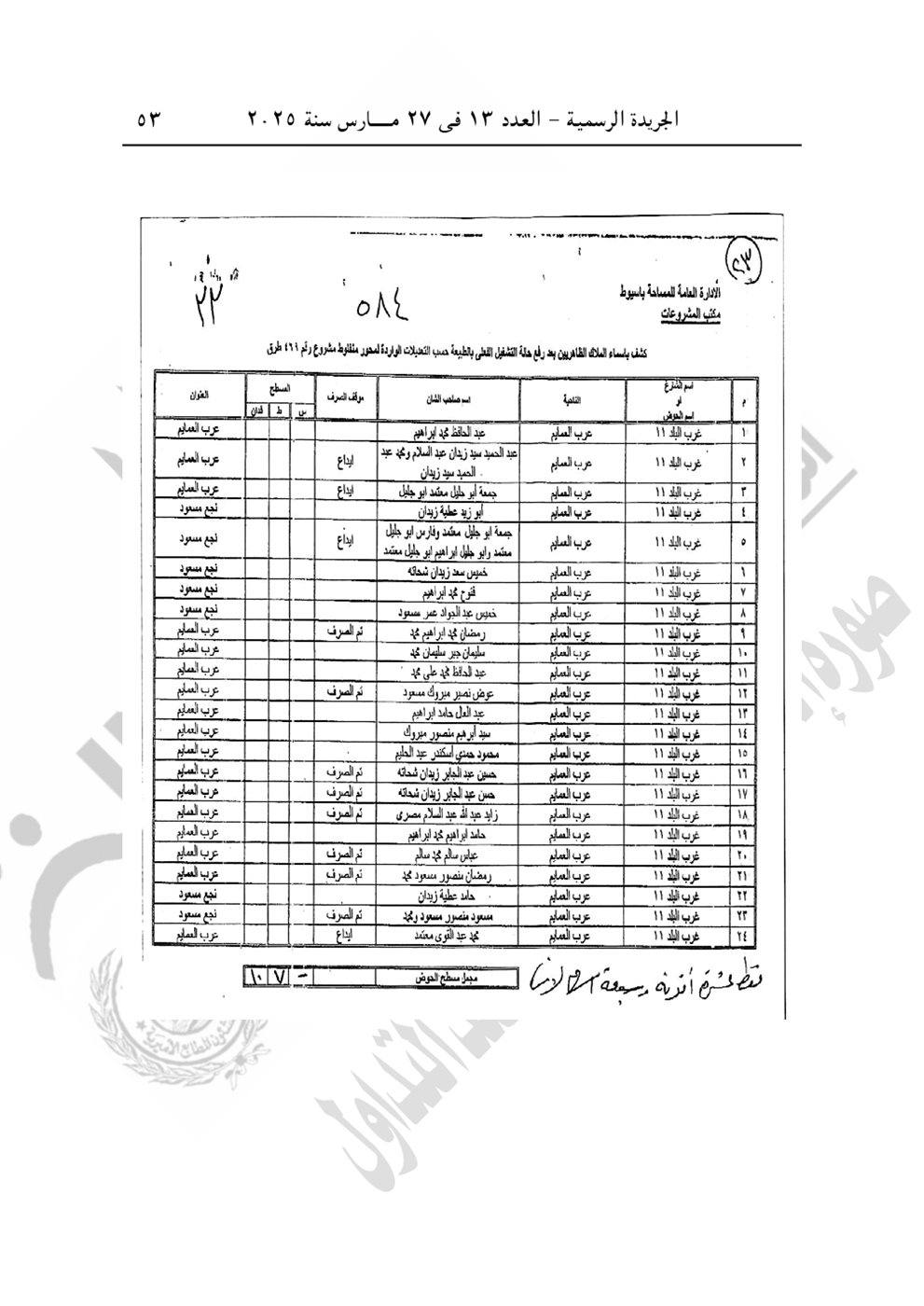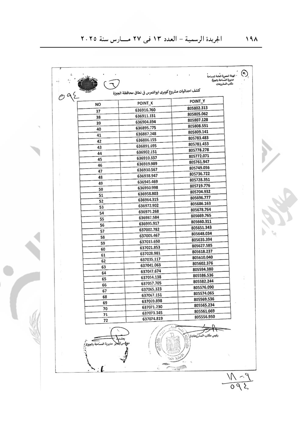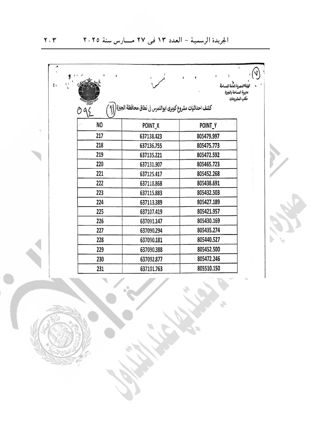 -و قرار رئيس مجلس الوزراء رقم 594 لسنة 2025، باعتبار مشروع إنشاء كوبرى للسيارات أعلى مزلقان أبو النمرس بمحافظة الجيزة، من أعمال المنفعة العامة.