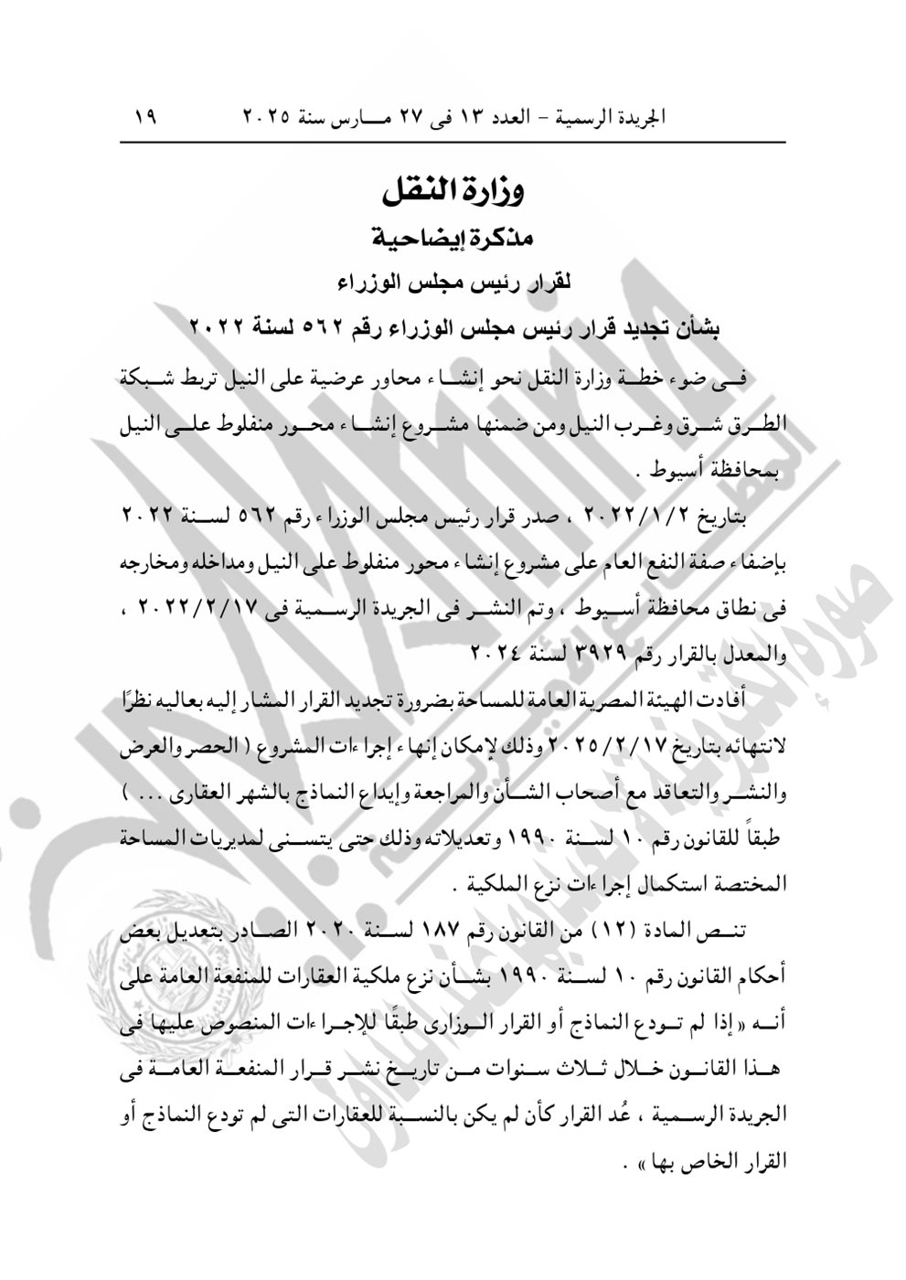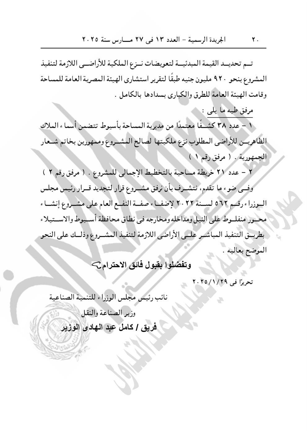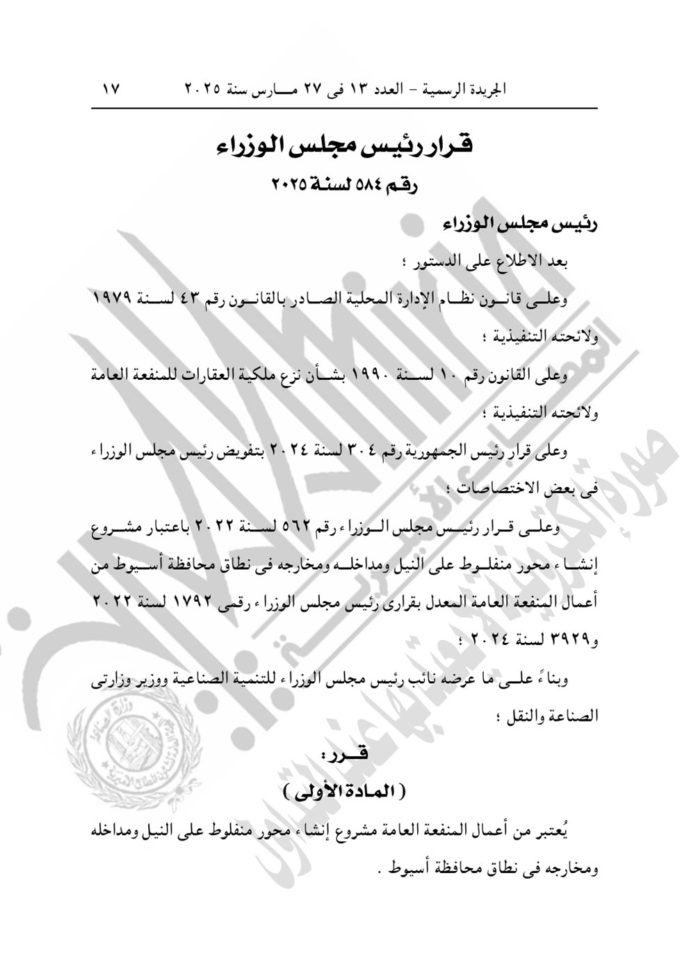 -قرار رئيس مجلس الوزراء رقم 584 لسنة 2025، بشأن اعتبار مشروع إنشاء محور منفلوط على النيل ومداخله ومخارجه فى نطاق محافظة أسيوط، من أعمال المنفعة العامة.