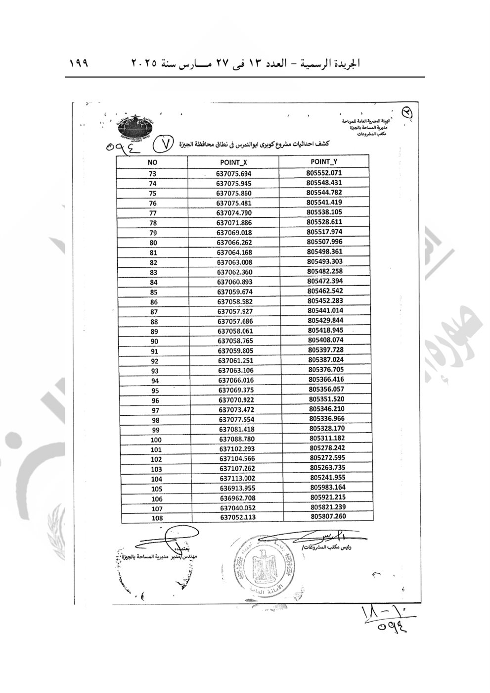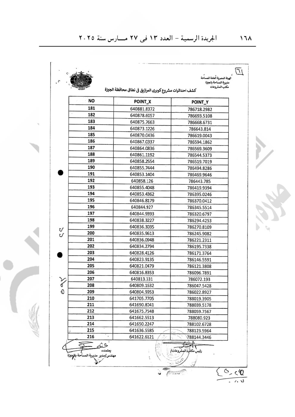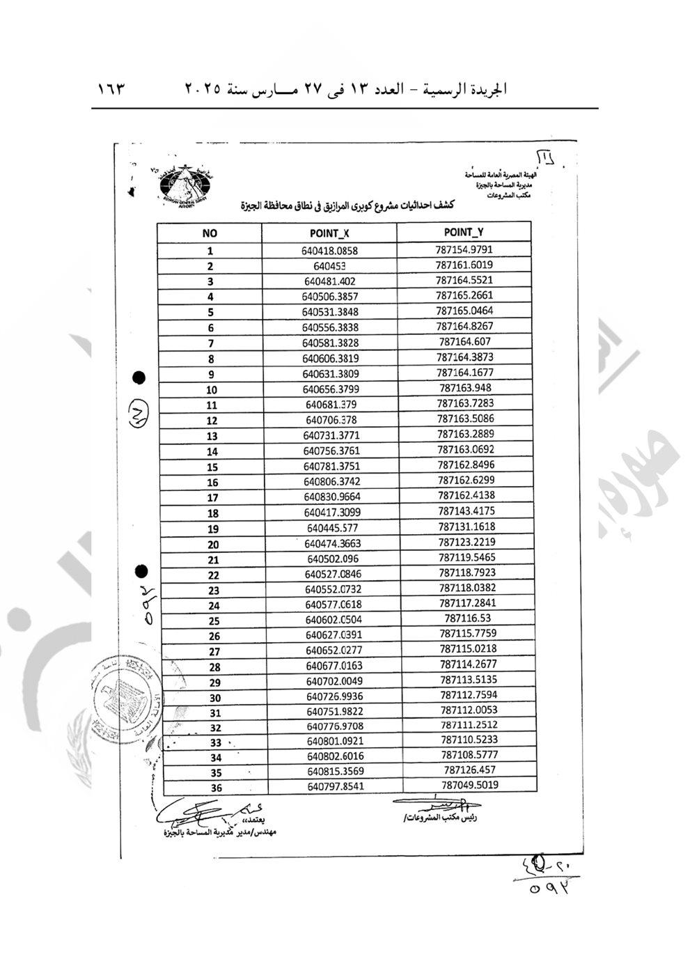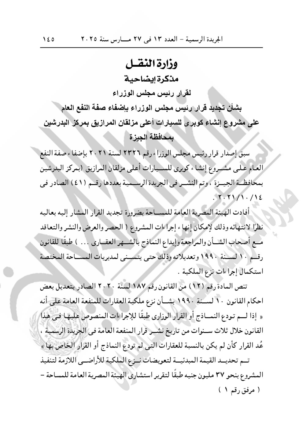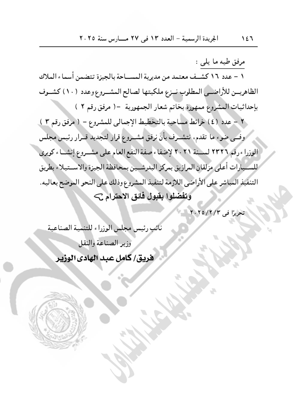 -وقرار رئيس مجلس الوزراء رقم 593 لسنة 2025، باعتبار مشروع إنشاء كوبرى للسيارات أعلى مزلقان المرازيق بمركز البدرشين محافظة الجيزة، من أعمال المنفعة العامة.
