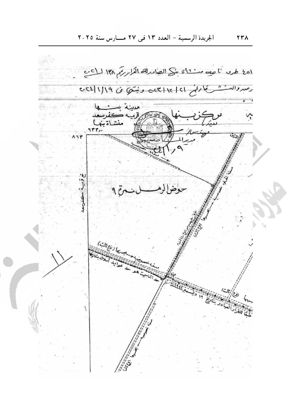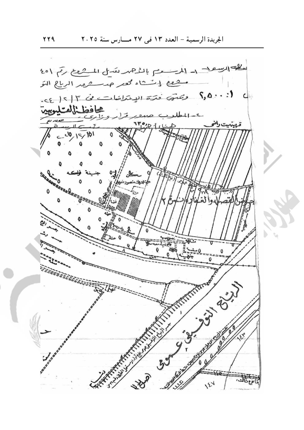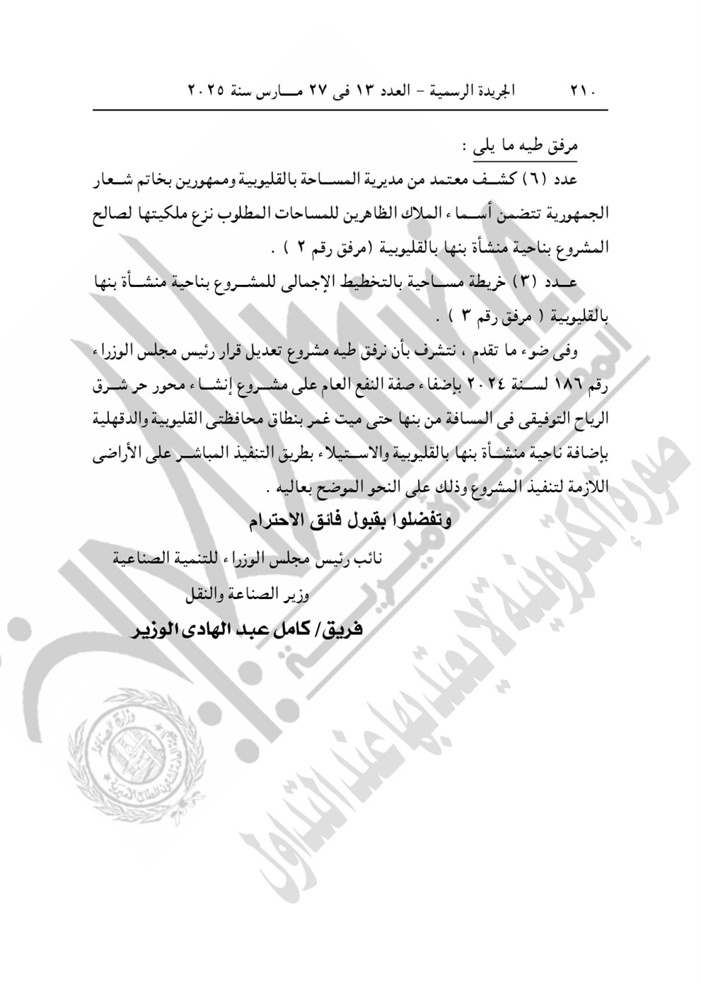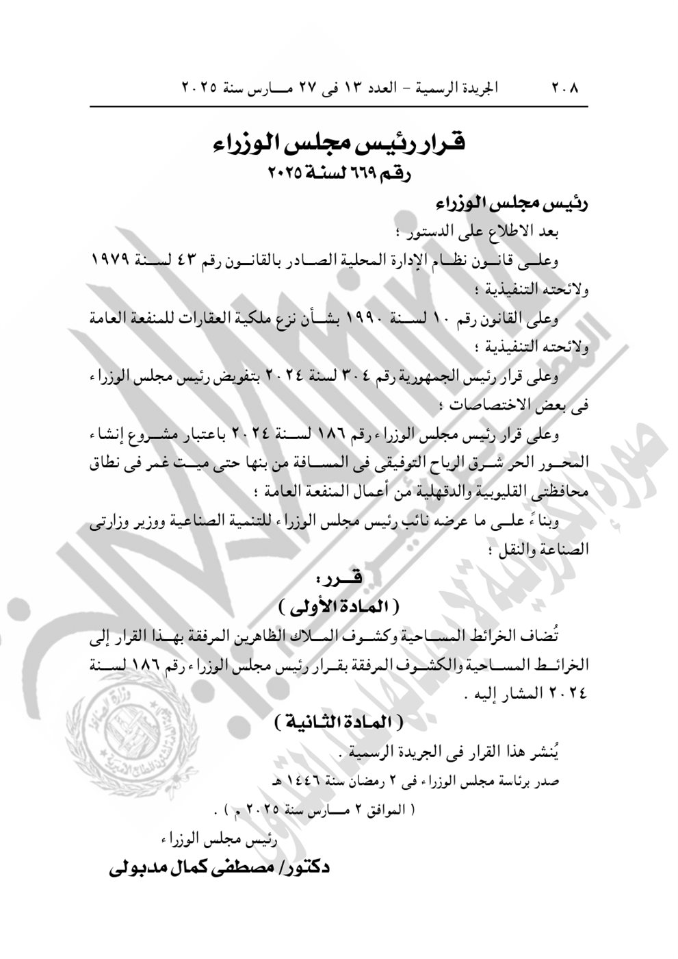-وقرار رئيس مجلس الوزراء رقم 669 لسنة 2025، بشأن إضافة الخرائط المساحية وكشوف الملاك الظاهرين المرفقة بهذا القرار، إلى الخرائط المساحية والكشوف المرفقة بقرار رئيس مجلس الوزراء رقم 186 لسنة، والذي يقضى باعتبار مشروع إنشاء المحور الحر شرق الرياح التوفيقى فى المسافة من بنها حتى ميت غمر فى نطاق محافظتى القليوبية والدقهلية من أعمال المنفعة العامة.