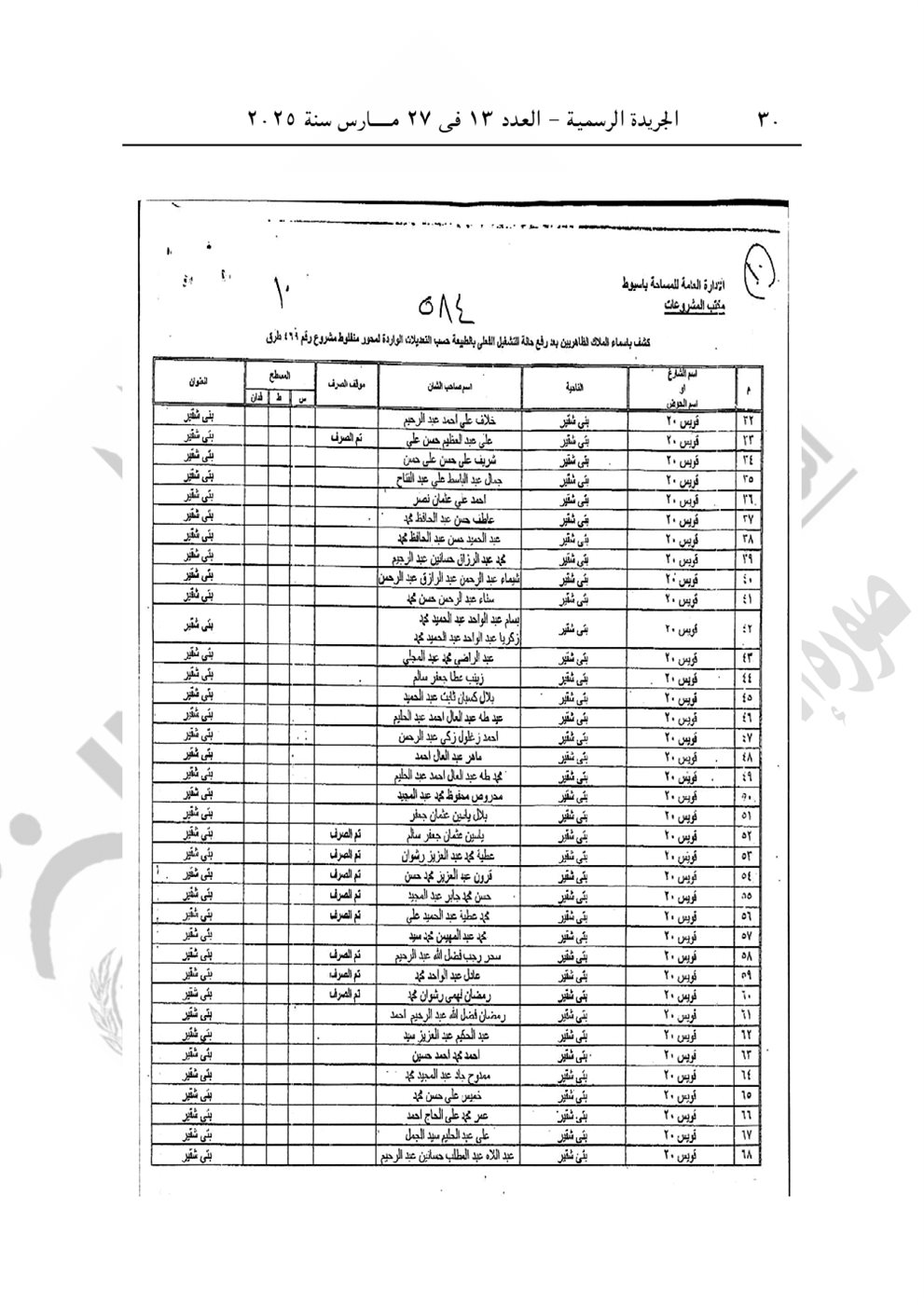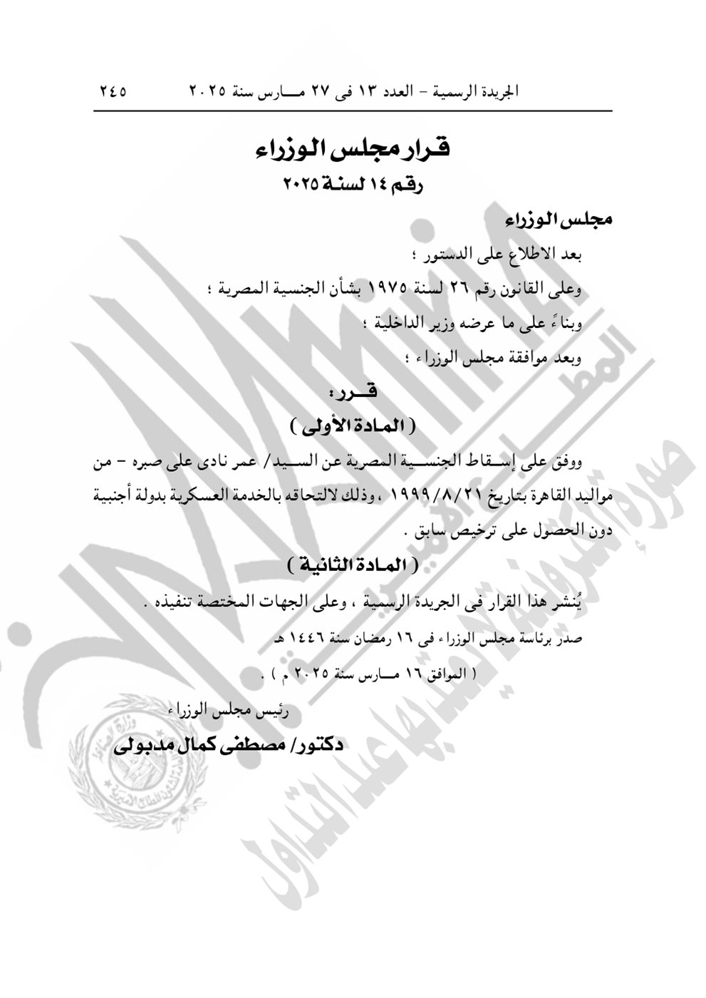 - وقرار مجلس الوزراء رقم 14 لسنة 2025، بالموافقة على إسقاط الجنسية المصرية عن عمر نادي علي صبره، من مواليد القاهرة، وذلك لالتحاقه بالخدمة العسكرية بدولة أجنبية دون الحصول على ترخيص سابق.