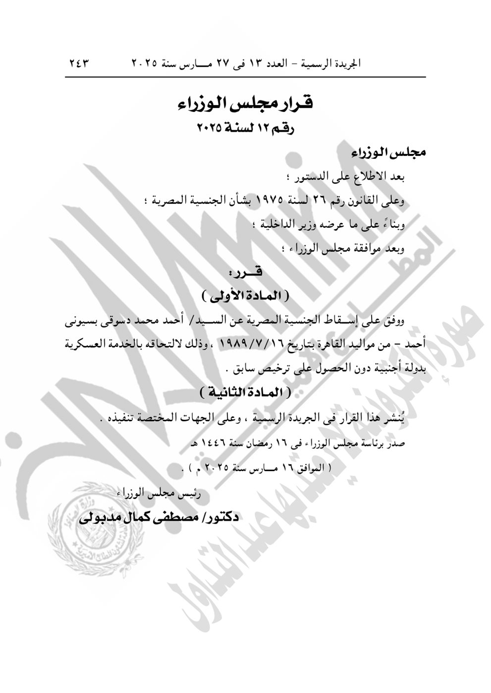 -وقرار مجلس الوزراء رقم 12 لسنة 2025، بالموافقة على إسقاط الجنسية المصرية عن أحمد محمد دسوقى بسيونى أحمد، من مواليد القاهرة، وذلك لالتحاقه بالخدمة العسكرية بدولة أجنبية دون الحصول على ترخيص سابق.