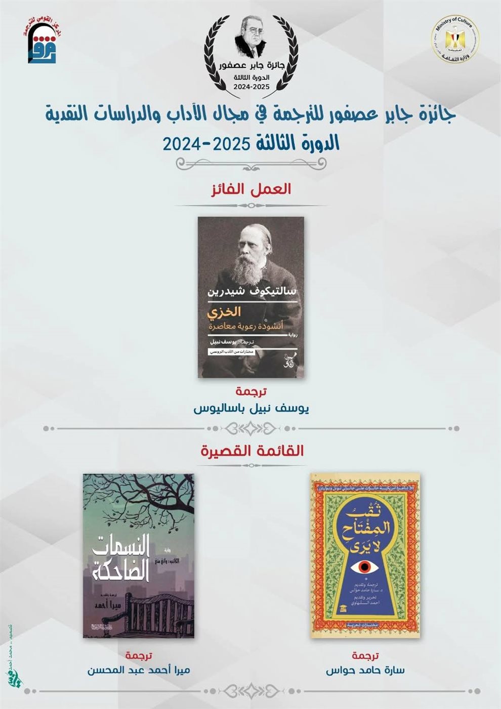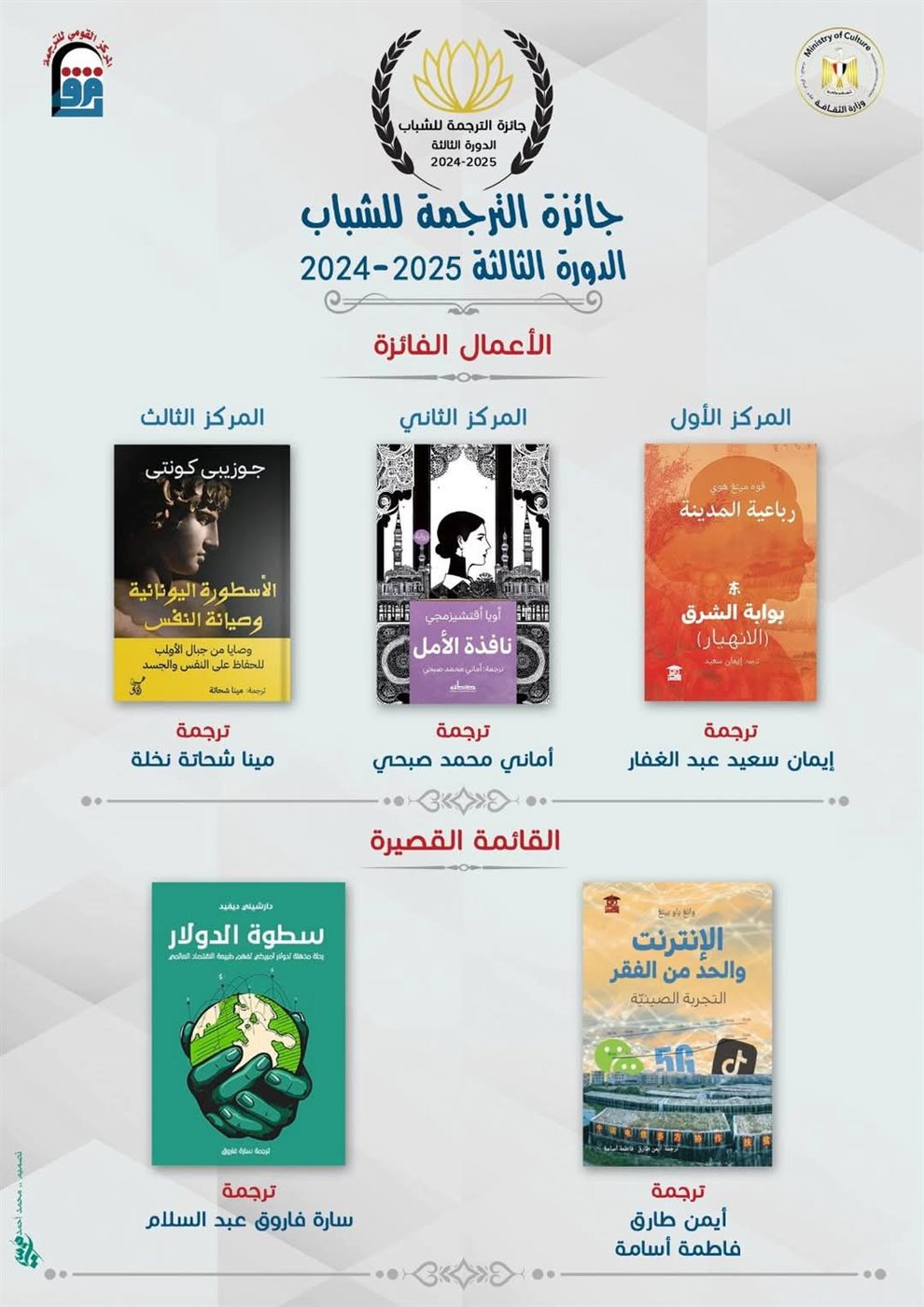 أعلن "المركز القومي للترجمة" برئاسة الدكتورة كرمة سامي عن أسماء الفائزين بجوائزه السنوية في الترجمة، والتي قد طرحها المركز في يوليو الماضي، وجاءت الأعمال الفائزة كالتالى: