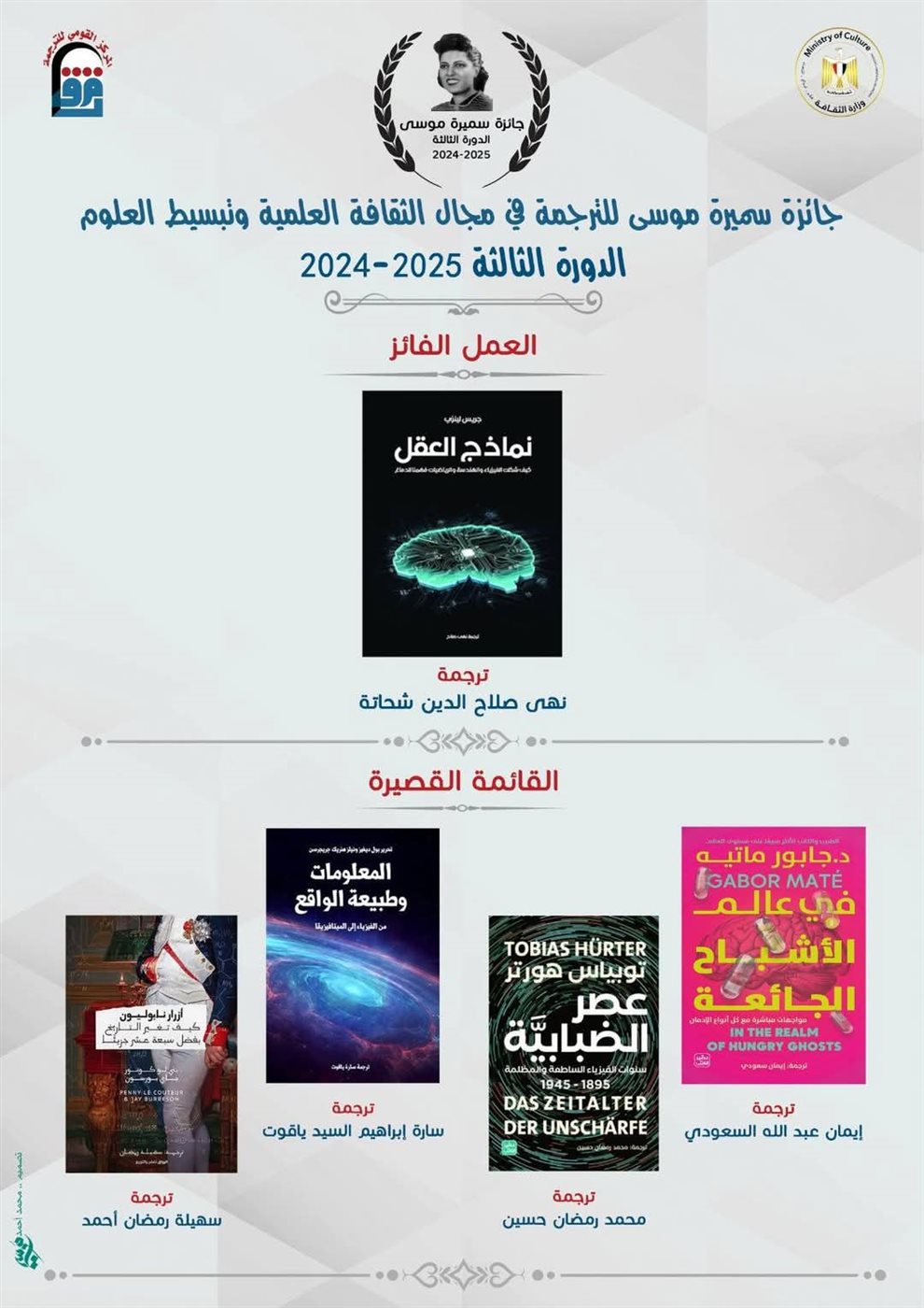 وفازت بجائزة سميرة موسى للترجمة في مجال الثقافة العلمية وتبسيط العلوم المترجمة نهى صلاح الدين شحاتة عن ترجمتها لكتاب "نماذج العقل" تأليف جريس لينزي.