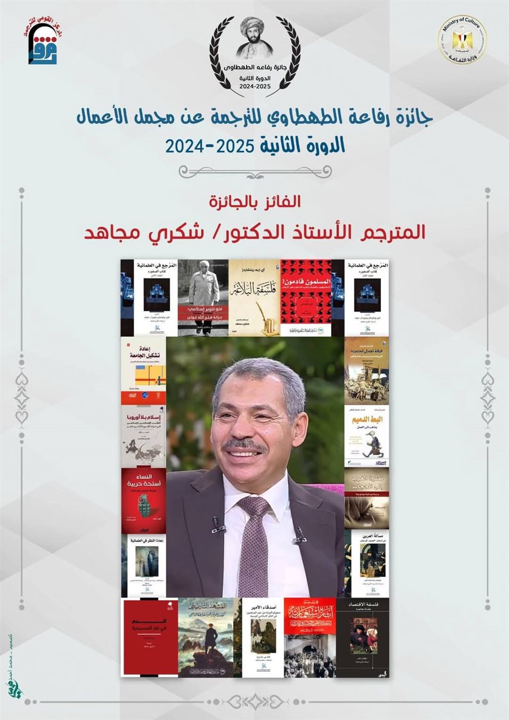 فاز بجائزة رفاعة الطهطاوي للترجمة عن مجمل الأعمال المترجم الأستاذ الدكتور شكري مجاهد، أستاذ الأدب بكلية التربية جامعة عين شمس وصاحب مشروع ترجمي متكامل يتضمن العشرات من الترجمات المهمة من بينها فرقة العمال المصرية والإسلام فوبيا والتطرف، ونظرة الغرب إلى الحجاب، وآثار استعمارية، والمشهد التاريخي، والتواصل عبر الثقافات.