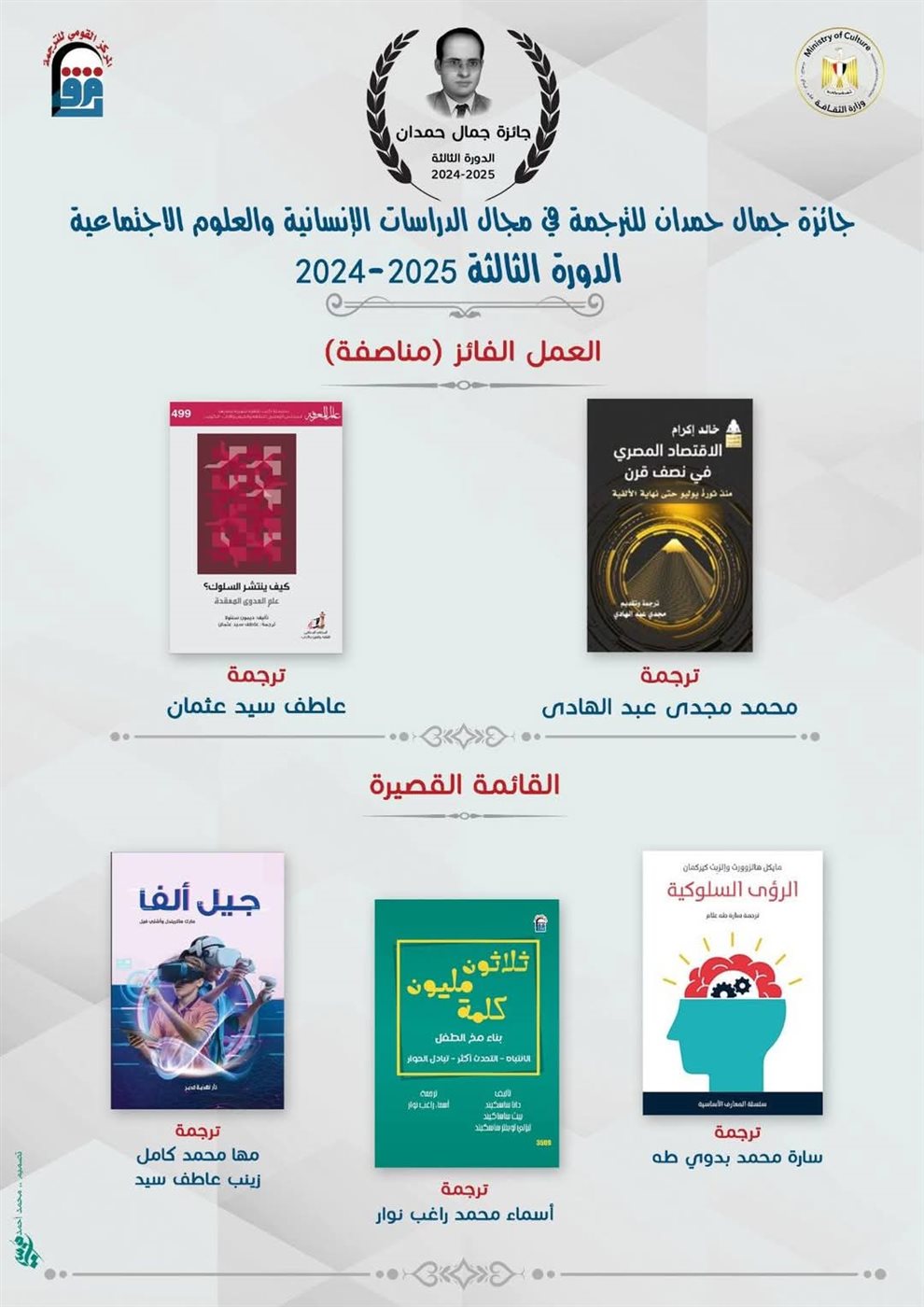 وفاز بجائزة جمال حمدان للترجمة في مجال الدراسات الإنسانية والعلوم الاجتماعية مناصفة كل من محمد مجدي عبد الهادي عن ترجمته لكتاب "الاقتصاد المصري في نصف قرن" تأليف خالد إكرام، وعاطف سيد عثمان عن ترجمته لكتاب "كيف ينتشر السلوك" تاليف ديمون سنتولا.