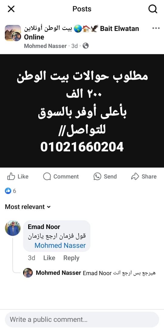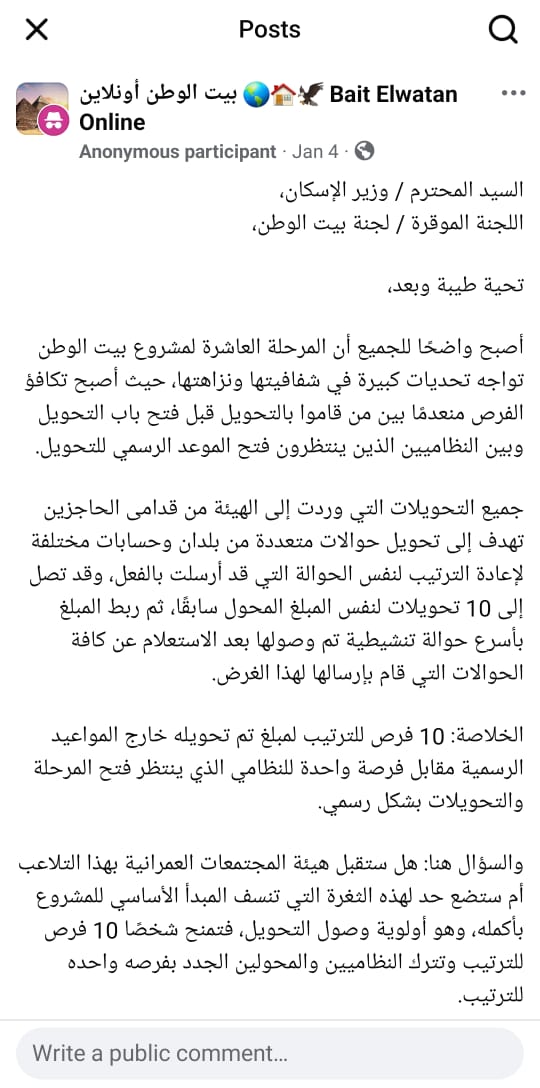 ولا يخفى على أحد أن البنوك في الخارج تقوم بتدقيق الحوالات الكبيرة وهذا يستغرق وقتًا لتنفيذها، بينما تمر الحوالات الصغيرة إلكترونيًا وفوريًا. وقد كان لهم ما أرادوا حيث استولوا على المراكز المتقدمة في المسابقة، وللأسف لم تعر لجنة بيت الوطن أي اهتمام لتواريخ الحوالات الكبيرة السابقة! وسط ذهول وغضب وامتعاض المغتربين الذين منحوا الدولة ممثلة في هيئة المجتمعات ثقتهم وأموالهم.
