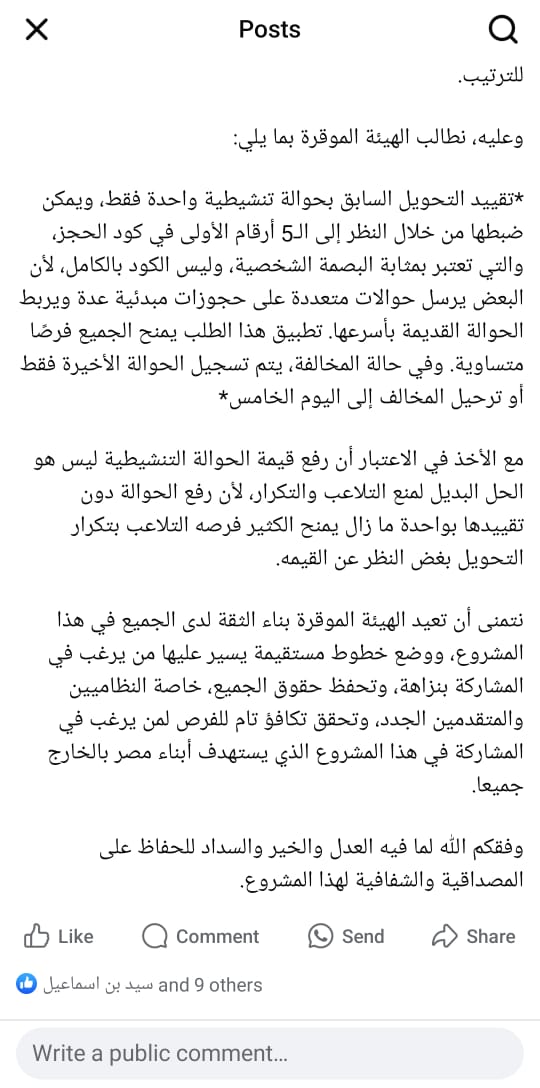 1- إعلان دليل رسمي للقواعد العامة للمشروع، حتى لا يحدث لبس بين القواعد العامة وبين شروط كل مرحلة. فالقواعد العامة هي قواعد راسخة أشبه بالقانون لا يمكن تجاوزها أو انتهاكها، ويترتب على تجاوزها جزاءات سواء للمغترب أو للموظف المسئول. ففي المراحل السابقة كانت لجنة بيت الوطن تعلن رسميًا على موقعها عن ورود حوالات قبل بداية المرحلة وأنها مخالفة للقواعد العامة للمشروع وسيتم ترحيلها في نهاية الترتيب. فالقواعد العامة ذات سمو على شروط المرحلة، ولا يمكن تغييرها بشكل دوري، وإذا حدث تغيير لابد من إعلانه. بل إن إعلانها هو شرط لسريانها في حق المخاطبين بها. وللأسف لا توجد مدونة أو دليل للقواعد العامة، وكل شخص يقوم بتأويل التنويهات التي يتم نشرها وفق مصالحه.