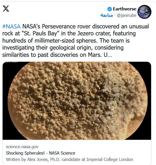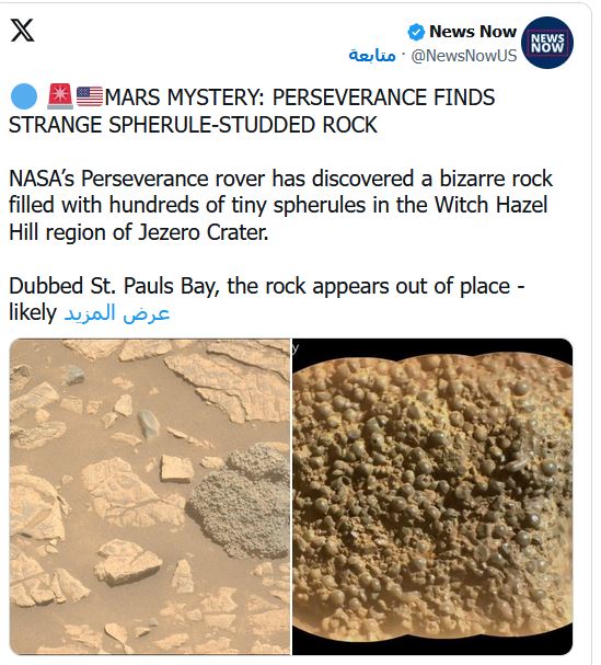 اكتشفت مركبة "بيرسيفيرانس" التابعة لوكالة ناسا صخرة غريبة على سطح المريخ أثارت حيرة العلماء، حيث تزخر بمئات الكريات الداكنة الدقيقة التي قد تحمل أدلة مهمة عن تاريخ الكوكب الأحمر.