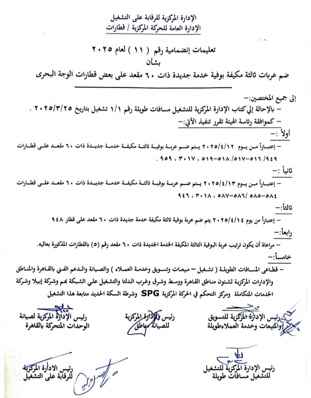 قررت هيئة السكك الحديدية اعتبارا من يوم ١٢/ ٤ /٢٠٢٥ إضافة عربة بوفيه درجة ثالثة مكيفة خدمة جديدة ذات ٦٠ مقعد على بعض قطارات الوجة البحرى على قطارات ارقام ٩٤٩ و٥١٦ - ٥١٧ و٥١٨ - ٥١٩ و٣٠١٩ و٩٥٩.