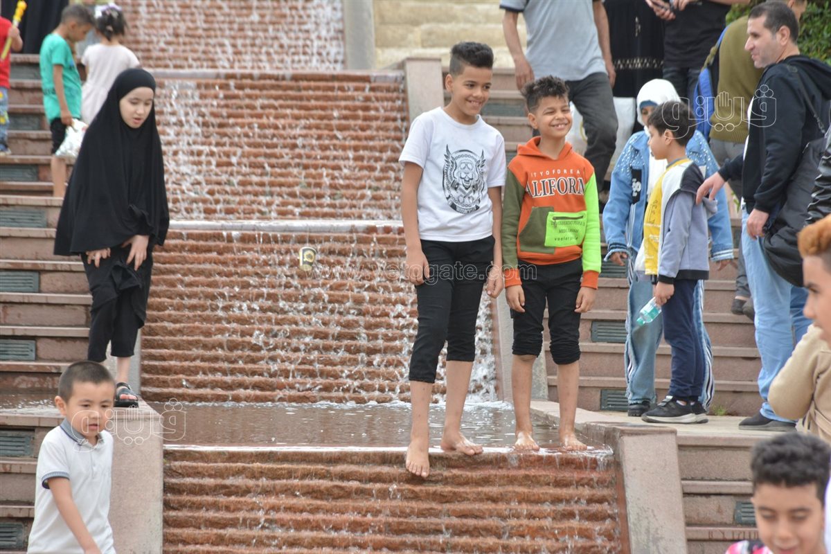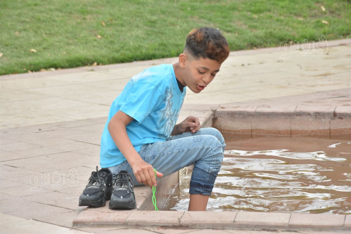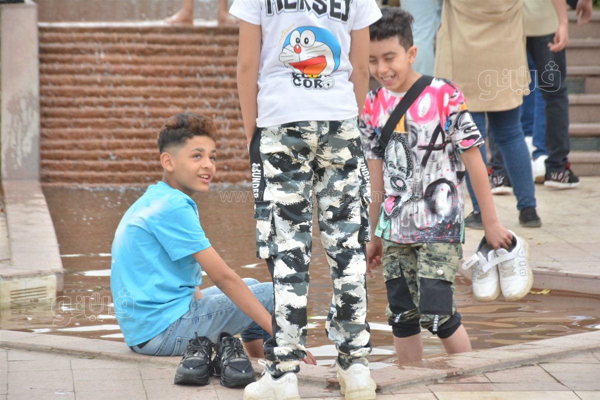اتجه الأطفال في حديقة الأزهر إلى اللعب في نافورة المياه للهروب من الحر والشمس القاسية اثناء احتفالهم بثاني أيام عيد الفطر المبارك.