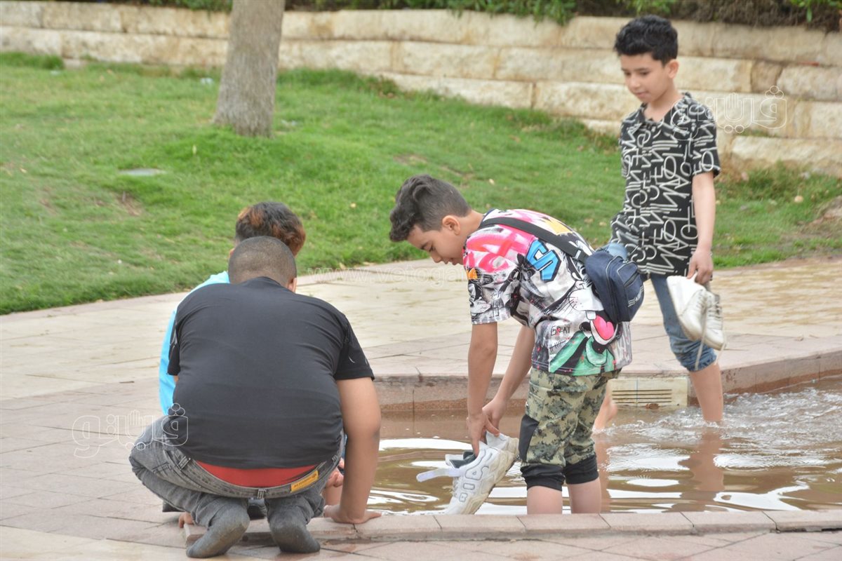 هربًا من الحر، الأطفال يلعبون بنافورة حديقة الأزهر بثاني أيام عيد الفطر (صور)
