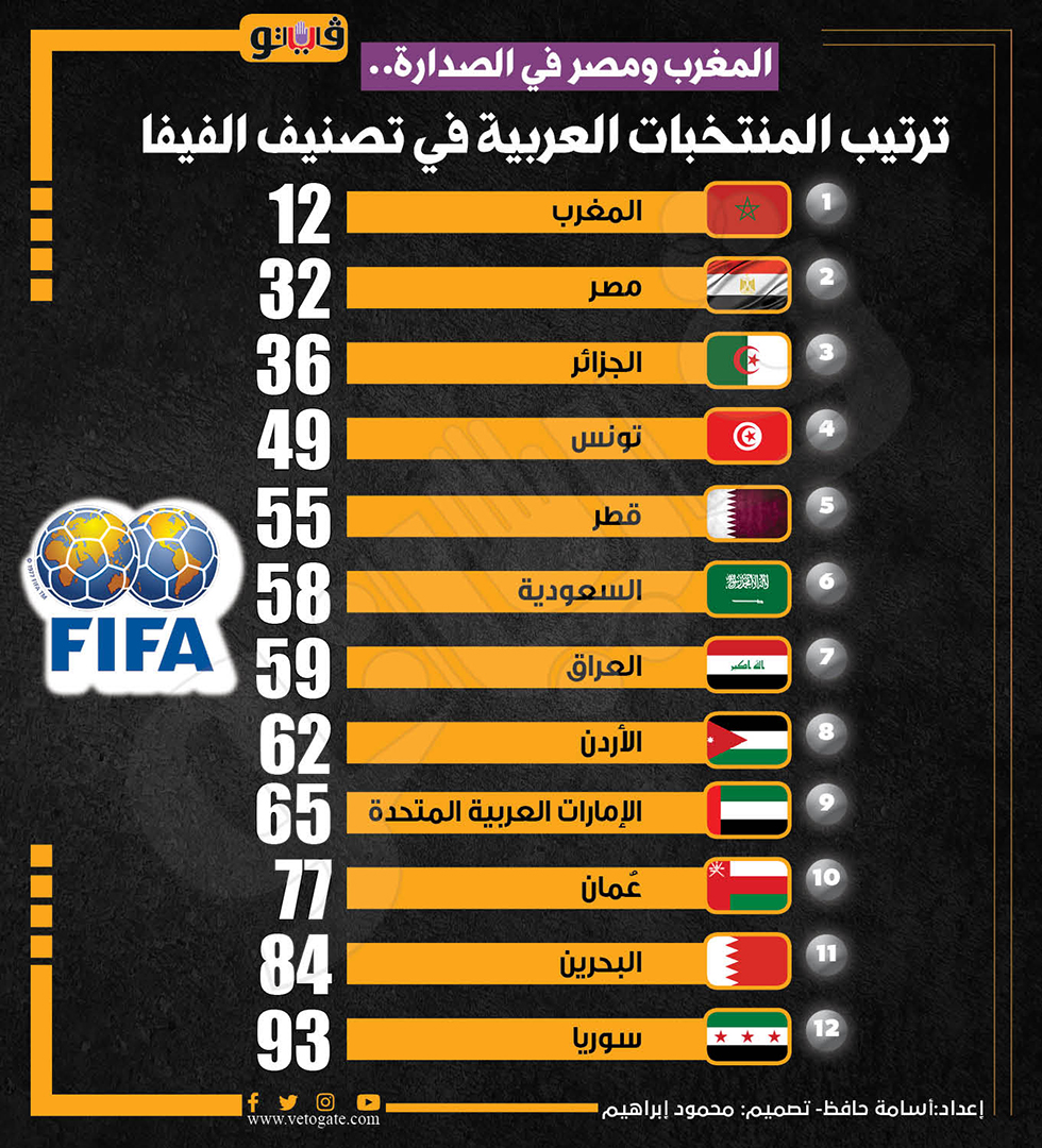 المغرب ومصر في الصدارة.. ترتيب المنتخبات العربية في تصنيف الفيفا (إنفوجراف)