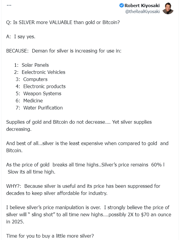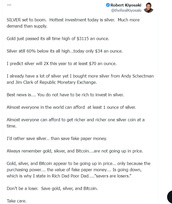 وتوقع روبرت كيوساكي أن يتضاعف سعر الفضة هذا العام ليصل إلى 70 دولارًا للأوقية على الأقل، وبرغم تجاوز الذهب أعلى مستوى له على الإطلاق عند 3115 دولارًا للأوقية، ولا تزال الفضة أقل بنسبة 60 في المئة من أعلى مستوى لها، وتتداول الفضة اليوم فقط عند 34 دولارًا للأوقية».