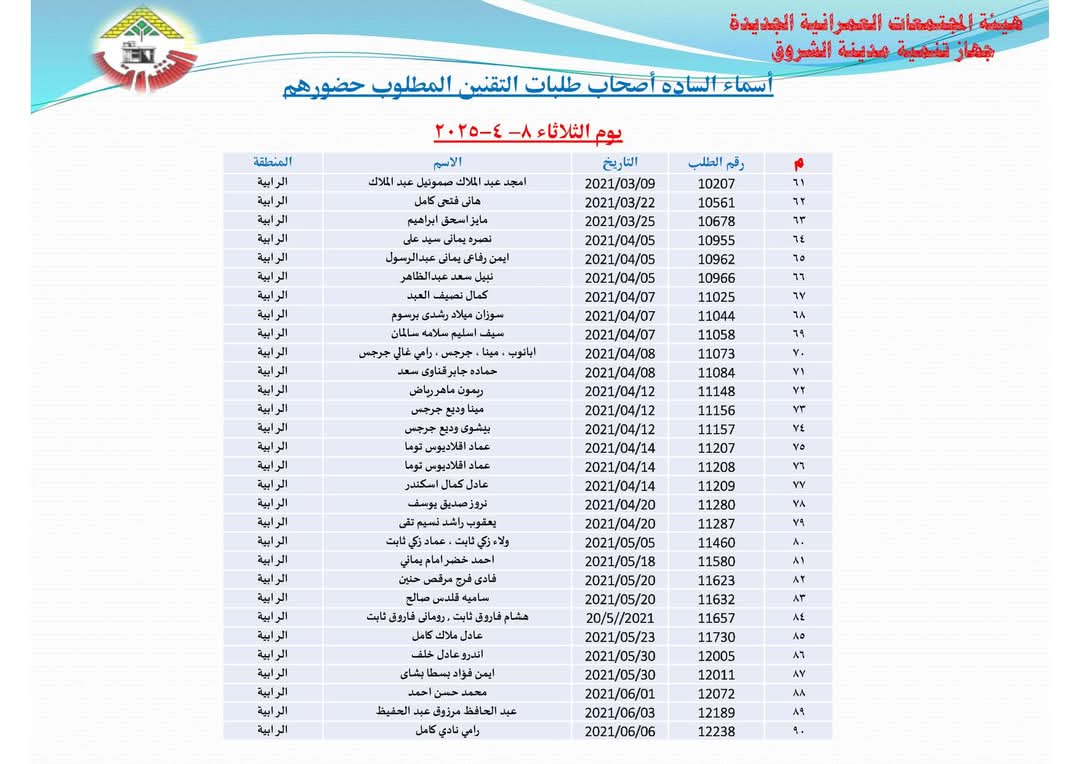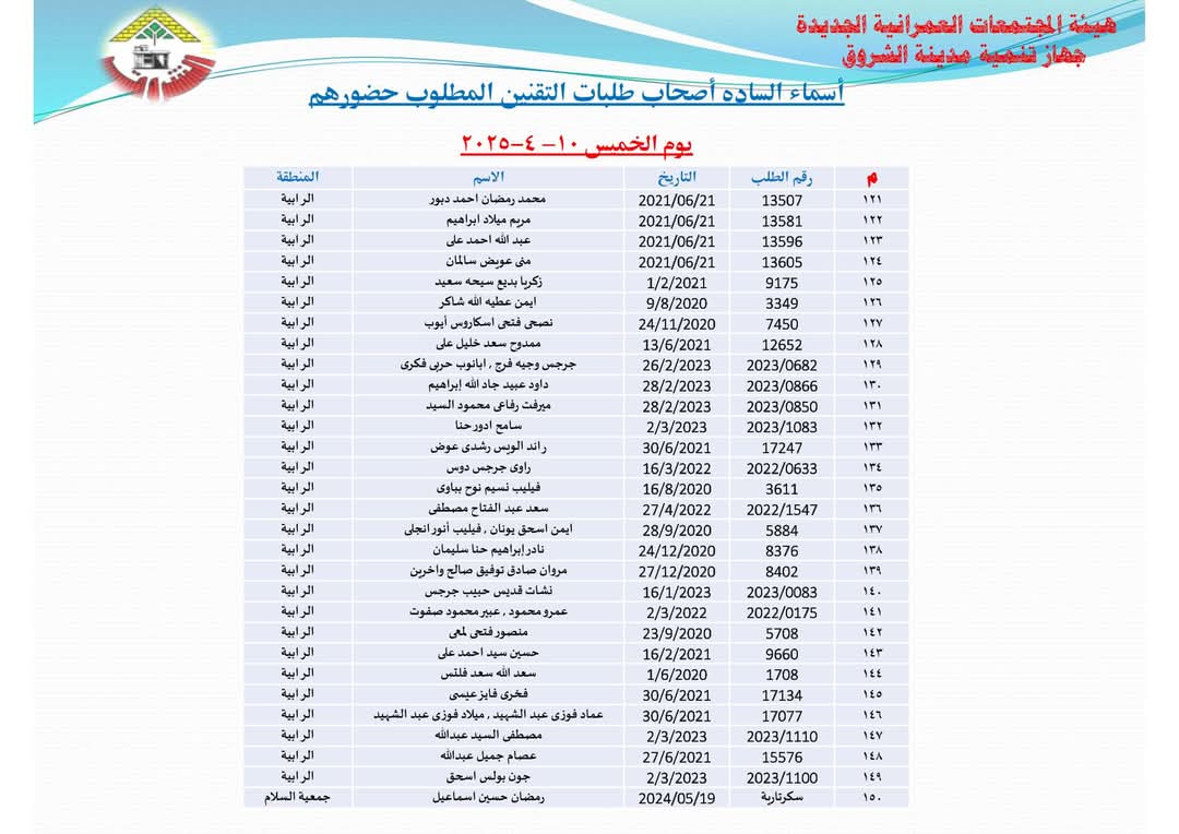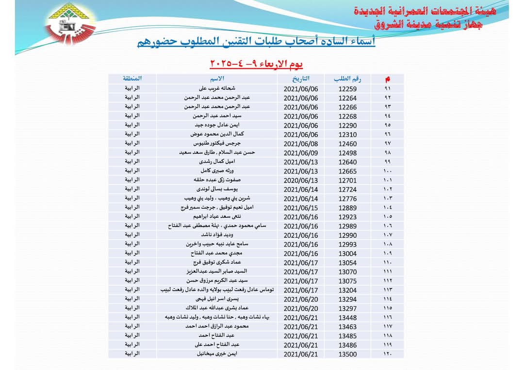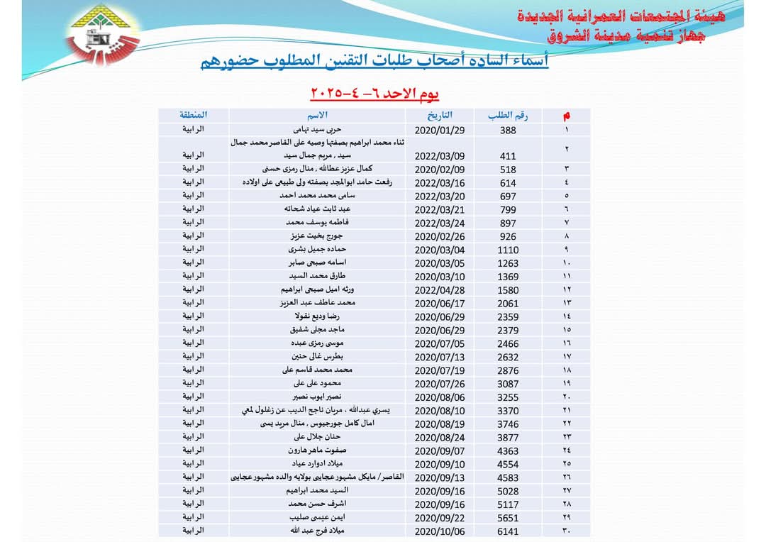 أعلنت هيئة المجتمعات العمرانية بوزارة الإسكان أسماء دفعة جديدة من المواطنين أصحاب طلبات تقنين أراضيهم بتوسعات مدينة الشروق، وذلك للحضور لمقر جهاز المدينة لاستكمال إجراءات التقنين بداية غدا الأحد الموافق 6 ابريل لاستكمال إجراءات التقنين.