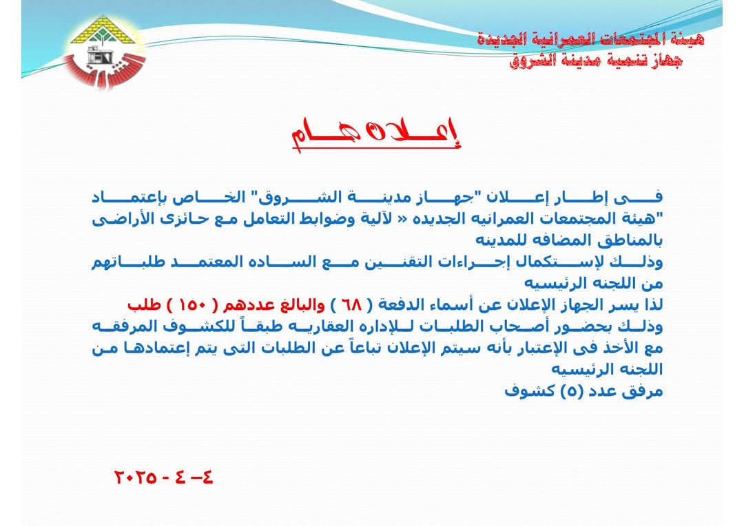 وأشار جهاز مدينة الشروق إلى أنه في إطار اهتمام الهيئة بآلية وضوابط التعامل مع حائزي الأراضي بالمناطق المضافة للمدينة يتم استقبال المواطنين أصحاب الطلبات لاستكمال إجراءات التقنين المعتمدة طلباتهم من اللجنة الرئيسية للتقنين.