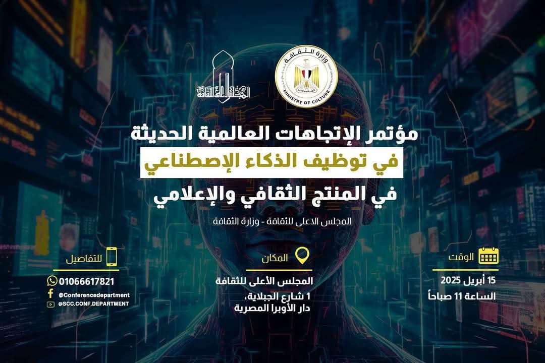 يعقد المجلس الأعلى للثقافة مؤتمر "الاتجاهات العالمية الحديثة في توظيف الذكاء الاصطناعي في المنتج الثقافي والإعلامي، يوم الثلاثاء الموافق 15 أبريل من 11 صباحًا إلى 4:30 عصرًا.