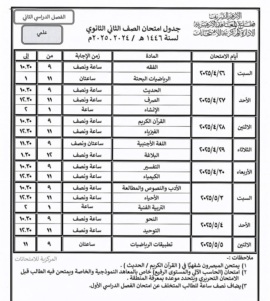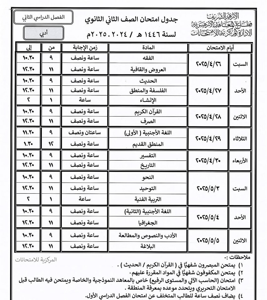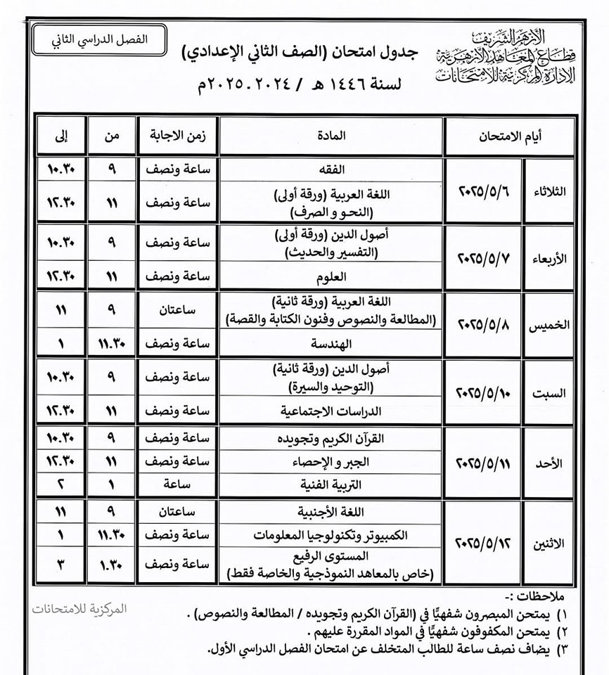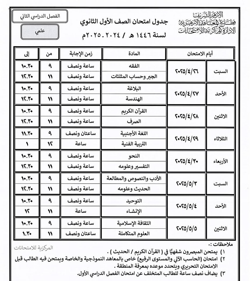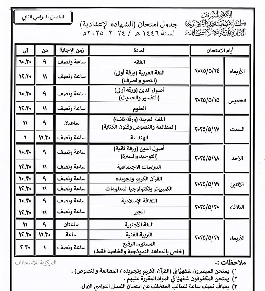 أعادت الإدارة المركزية للامتحانات بقطاع المعاهد الأزهرية نشر جداول امتحانات النقل، والشهادتين الابتدائية، والإعدادية، والبرنامج التأهيلي، مع التأكيد أنه لم يحدث تغيير في الجداول التي تم نشرها في فترة سابقة، وذلك على النحو التالي: